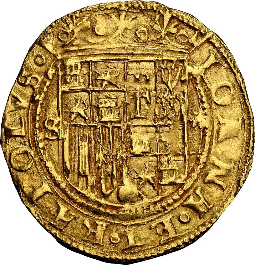 SPAIN, Seville, gold 1 escudo, Charles-Joanna, assayer * to right, mintmark S to left, NGC MS 62. Cal-196; Fr-153. 3.37 grams. Complete design all over with full legends and no doubling, also perfectly centered, hint of luster, a choice example to be sure.