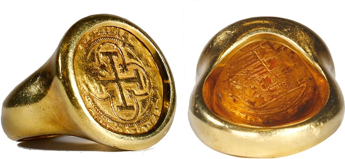 SPAIN, Seville, gold 1 escudo, Charles-Joanna, assayer * to right, mintmark S to left, mounted cross-side out in large (size 12) 18K gold ring. 35.8 grams total. Nice full cross with some legend details as well, sturdily mounted in a large gold ring that allows for viewing of the shield side.