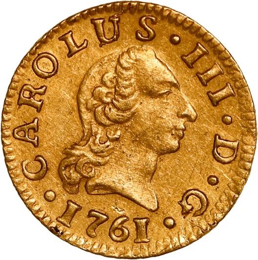 SPAIN, Seville, gold bust ½ escudo, Charles III (young bust), 1761 JV. Cal-1289; KM-389.2; Fr-279. 1.76 grams. Low-luster AU+ with faint hairlines and light mark on reverse, nice color.