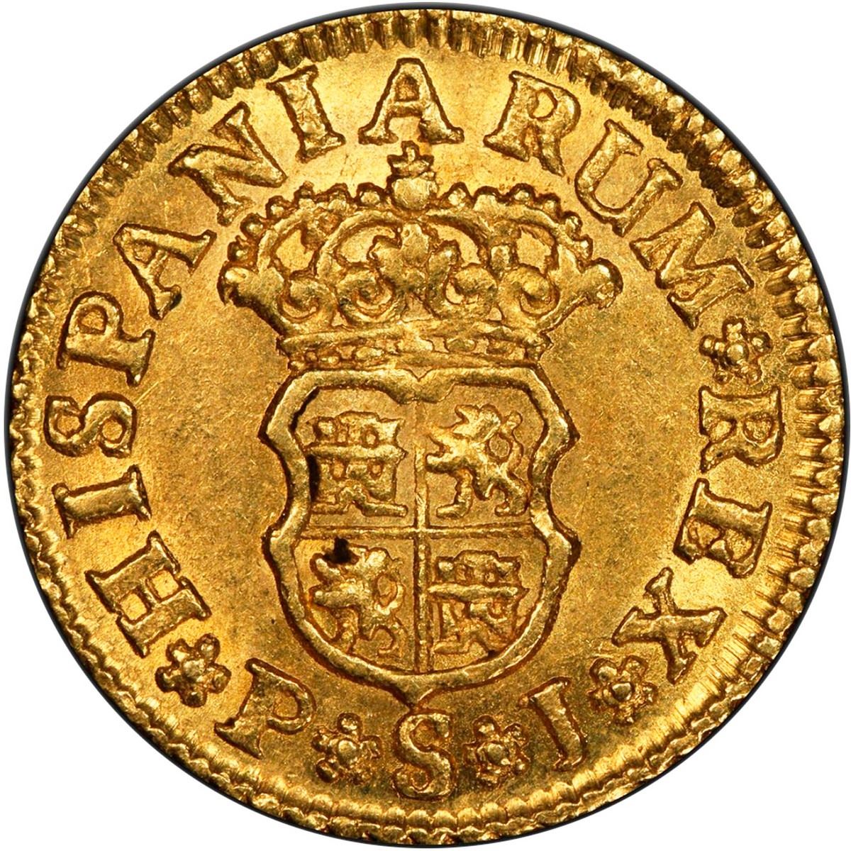SPAIN, Seville, gold bust ½ escudo, Philip V, 1743 PJ, PCGS MS63, finest known in PCGS census.