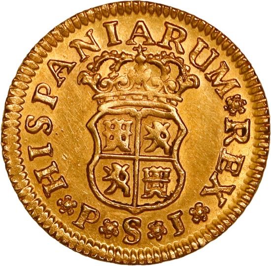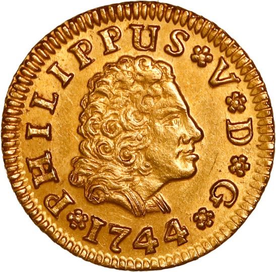 SPAIN, Seville, gold bust ½ escudo, Philip V, 1744 PJ, third bust. Cal-1649; KM-361.2; Fr-240. 1.79 grams. Well-struck UNC with choice full details including rims, rich gold color, very faint hairlines on fields, still a desirable grade for this early type.
