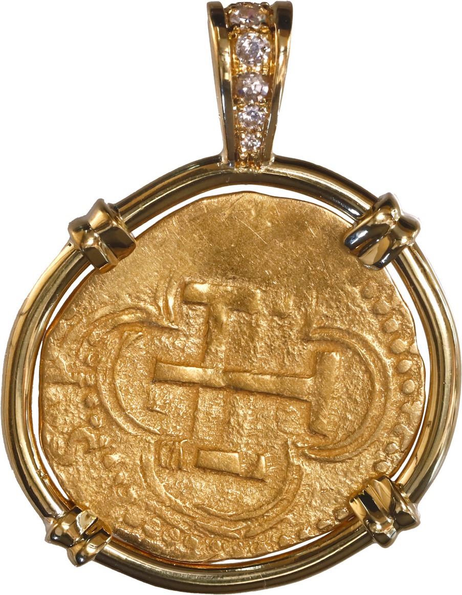 SPAIN, Seville, gold cob 1 escudo, Philip II, assayer Gothic D to right, mintmark S to left, mounted cross-side out in 18K gold pendant with fixed bail and diamonds. 8.52 grams total. XF piece with unusual cross from wide doubling, rather lustrous with rich golden toning, nearly complete shield with clear assayer and partial king's name in legend.