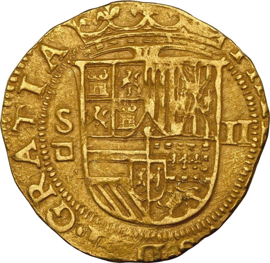 SPAIN, Seville, gold cob 2 escudos, Philip II, assayer Gothic D below mintmark S to left, denominati