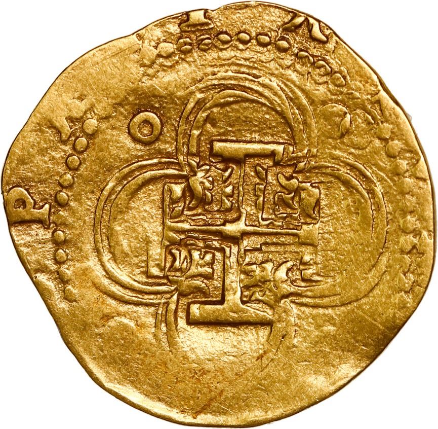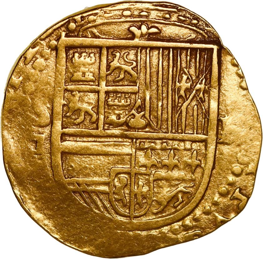 SPAIN, Seville, gold cob 2 escudos, Philip II, assayer Gothic D below mintmark S to left, denomination II to right. Cal-828; Fr-169. 6.64 grams. XF with smoothed edge and hairlines, nice bold shield and full cross (if a bit doubled).