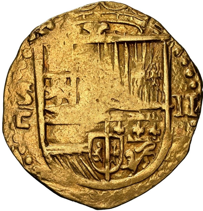 SPAIN, Seville, gold cob 2 escudos, Philip II, assayer Gothic D with open right side below mintmark