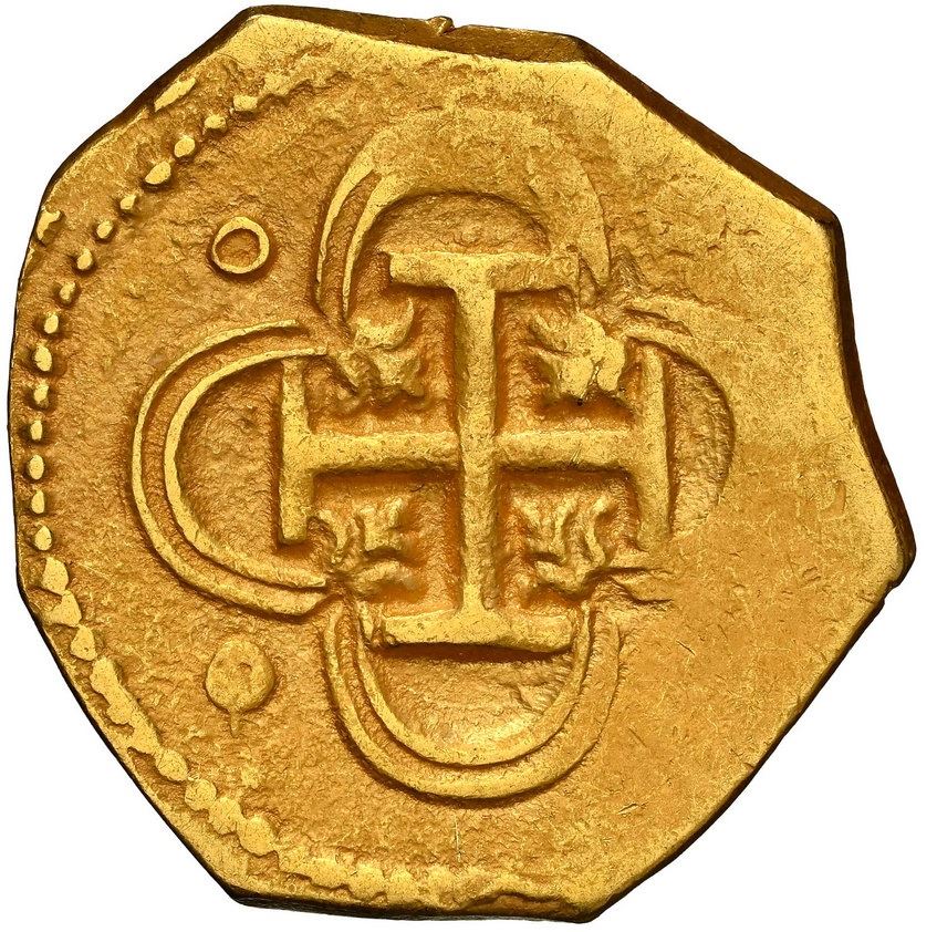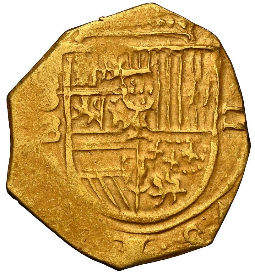 SPAIN, Seville, gold cob 2 escudos, Philip III, assayer B, NGC AU 58. Cal-Type 197; Fr-189; KM-20. 6.68 grams. Interestingly octagonal flan with choice full shield and cross, clear S-B to left and full denomination II to right, some peripheral flatness but smooth surfaces all over, unlisted variety with inner ring inside obverse legend.