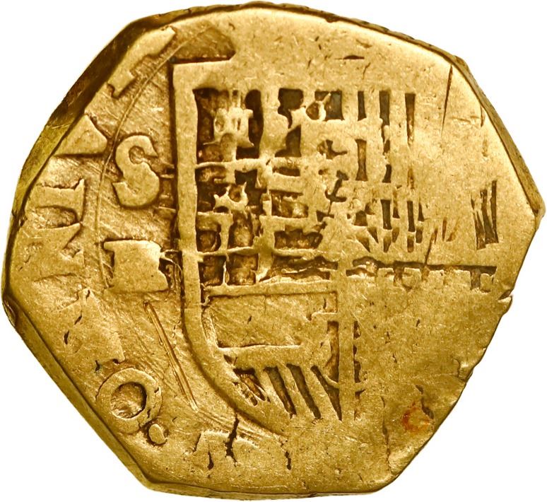 SPAIN, Seville, gold cob 2 escudos, Philip III, assayer B, OMNIVM in legend. Cal-1050; Fr-unl (cf 189). 6.63 grams. AXF with bold S-B and OMNIVM, also full cross, scratch below assayer.
