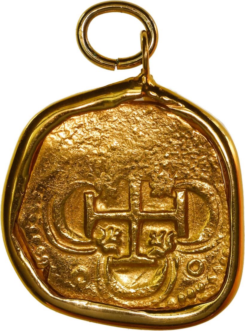 SPAIN, Seville, gold cob 2 escudos, Philip III, assayer B below mintmark S to left, denomination II to right, mounted in 14K (unmarked) gold pendant with swivel bail. 9.53 grams total. AU with bold, nearly complete cross and partial shield, clear mintmark and assayer, bright surfaces from cleaning, securely mounted in a fitted pendant setting.