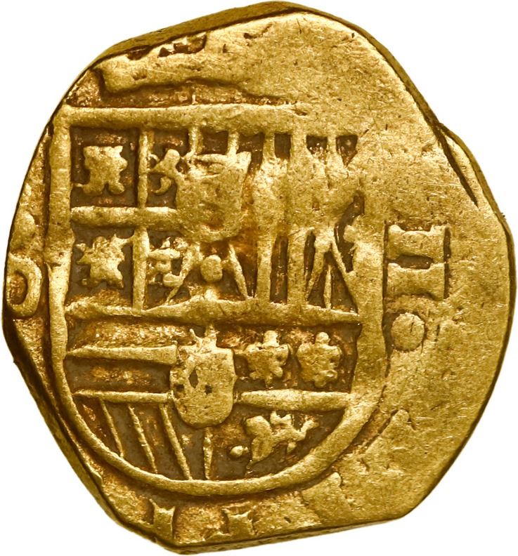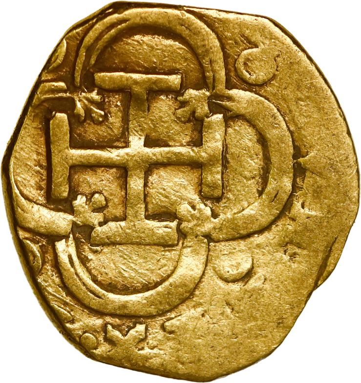 SPAIN, Seville, gold cob 2 escudos, Philip III, assayer D. Cal-Type 197; Fr-189; KM-20. 6.67 grams. VF+ with bold full shield and choice cross.