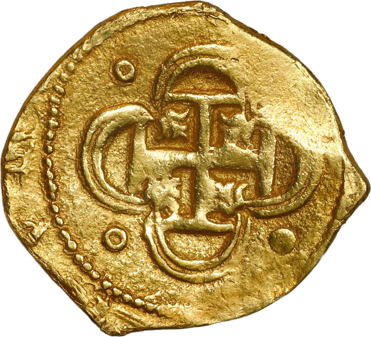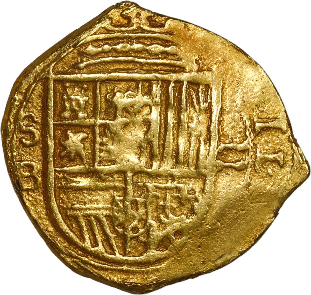 SPAIN, Seville, gold cob 2 escudos, Philip III, no date (OMNIVM variety), assayer B, NGC AU details / environmental damage. Cal-1050; KM-unl; Fr-unl (cf 189). 6.71 grams. Bold mintmark and assayer to left of full shield, clear denomination plus partial king's name at right, nice full cross with some legend detail and border of dots (which the later, dated issues lack), shiny and slightly granular surfaces.