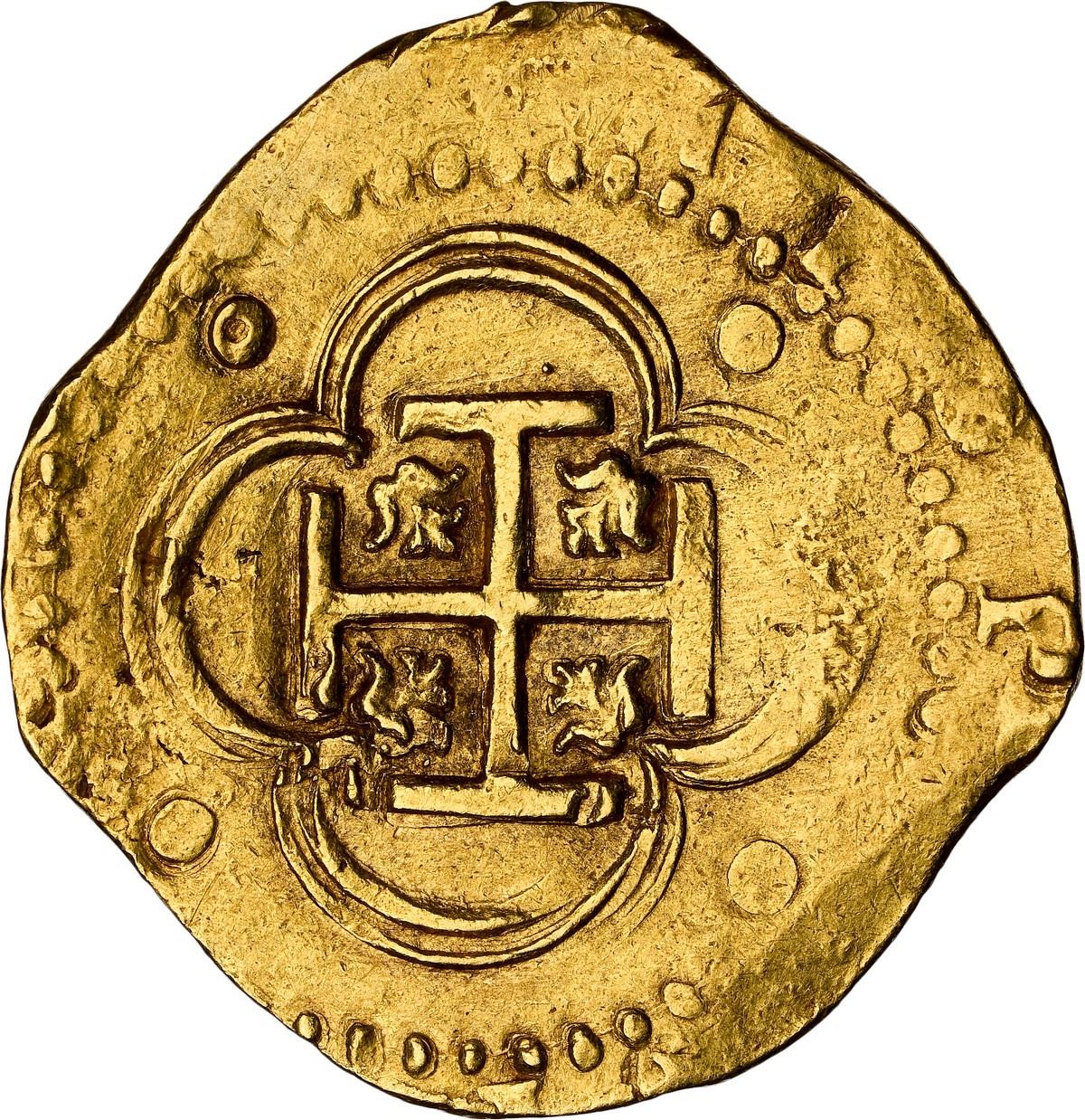 SPAIN, Seville, gold cob 4 escudos, Philip II, 1590/89 date to right, assayer Gothic D below mintmark S and denomination IIII to left, NGC MS 60, finest and only example in NGC census. Cal-892; Fr-158. 13.48 grams. Great full cross-and-tressure, bold full shield with full S•IIII-D to left and 1590 date to right with fairly clear 89 under-digits, parts of legend, traces of toning in crevices.