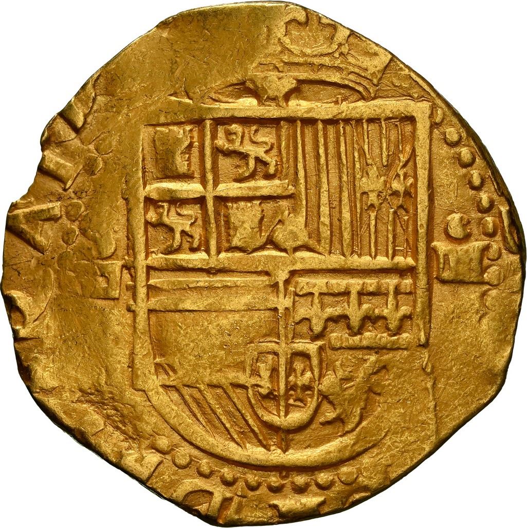 SPAIN, Seville, gold cob 4 escudos, Philip II, assayer Gothic D, NGC AU 55. Cal-887; Fr-158. 13.47 grams. Rich gold color, nice full shield with full denomination o-IIII to right (the mintmark-assayer to left present but weaker), good full cross-and-tressure, some legend.