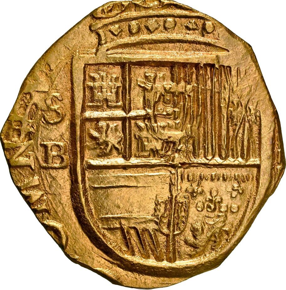 SPAIN, Seville, gold cob 4 escudos, Philip III, assayer B, OMNIVM in legend, NGC MS 62, finest known in NGC census. Cal-1097; Fr-185. 13.48 grams. Exceptionally bold full cross-and-tressure and shield with full S-B to left inside clear OMNIVM, lustrous with hint of light red toning, the finest on record and deservedly so.