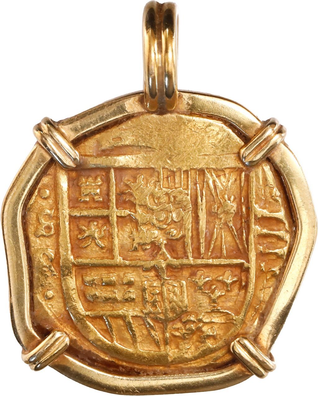 SPAIN, Seville, gold cob 4 escudos, Philip IV, assayer R, mounted cross-side out in 18K gold pendant