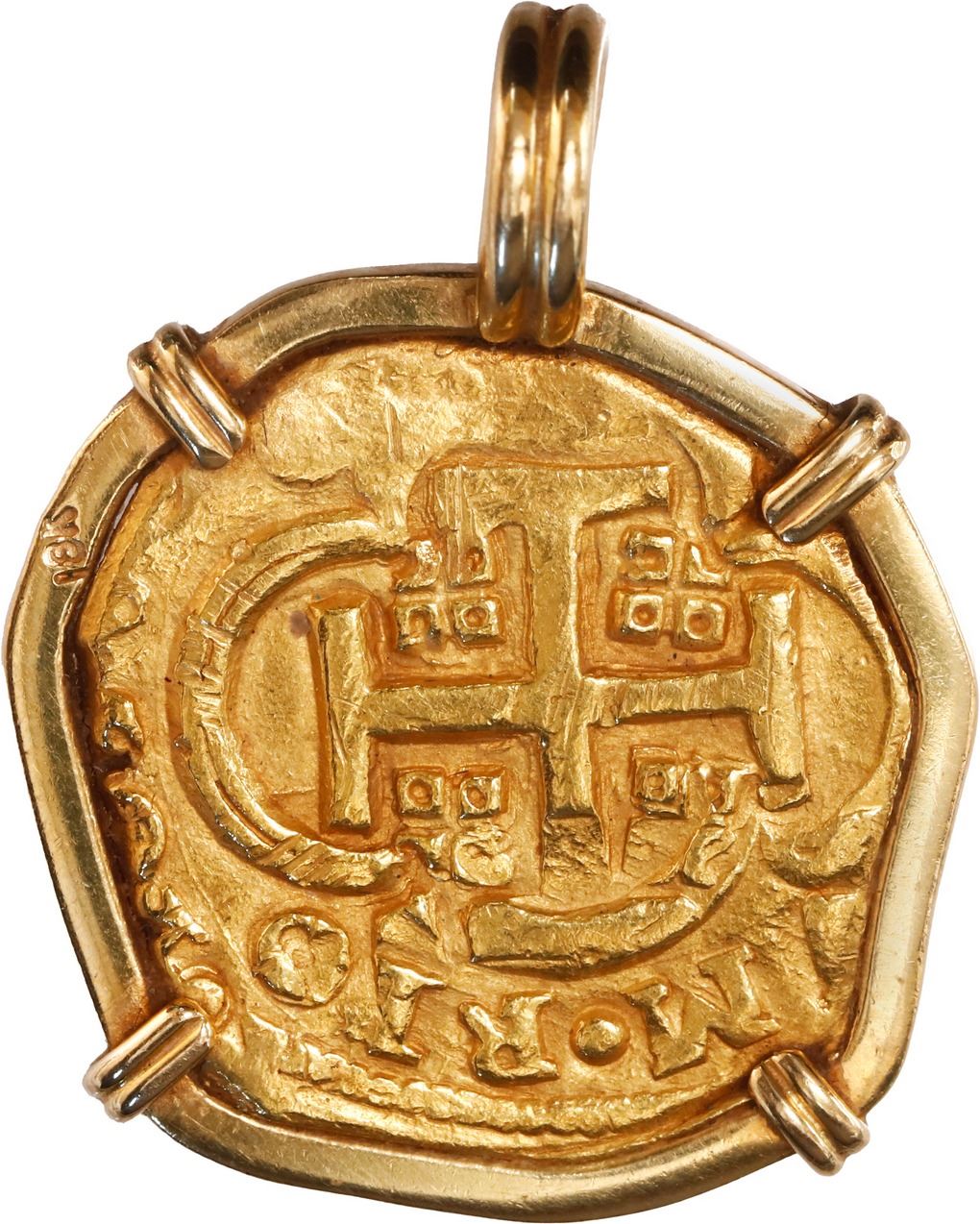 SPAIN, Seville, gold cob 4 escudos, Philip IV, assayer R, mounted cross-side out in 18K gold pendant with fixed bail. 19.87 grams total. Full cross with bold partial legend, choice complete shield also well aligned for wearing facing out, clear mintmark and assayer, XF overall with minor scuff on cross.