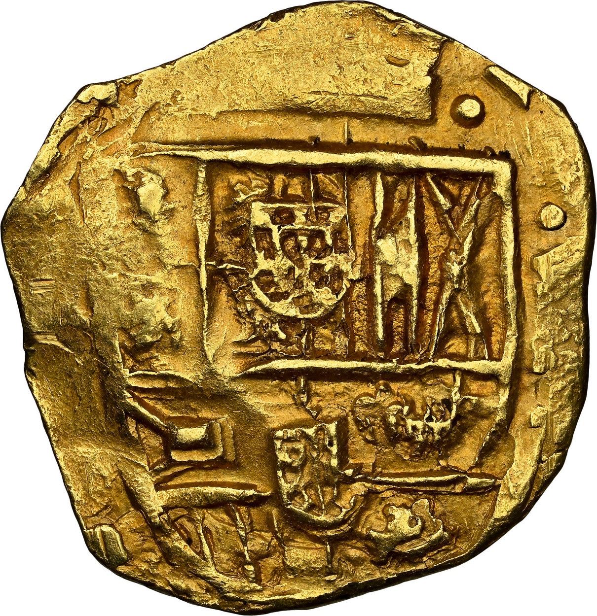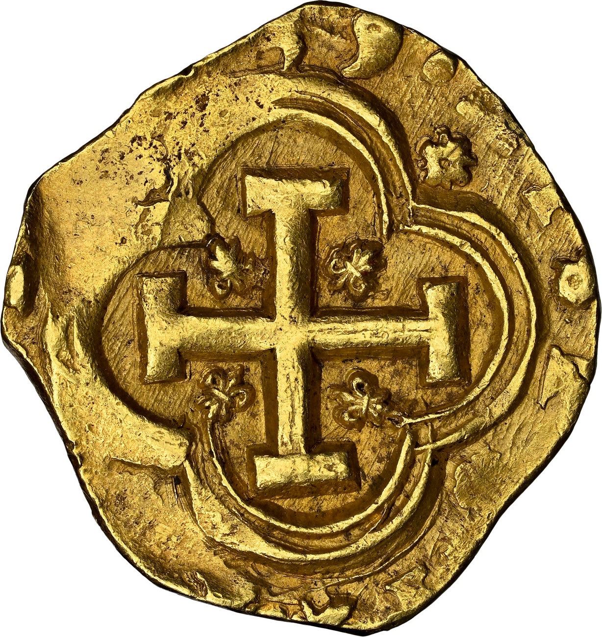 SPAIN, Seville, gold cob 8 escudos, 1659 (R), NGC MS 62, finest and only example in NGC census. Cal-1980; Fr-200; KM-145. 26.58 grams. A very bold and rustic cob with dramatically full shield and cross enhanced by deep toning, also bold full 59 of date despite typically crude peripheries, an important coin for the 8-escudos specialist.