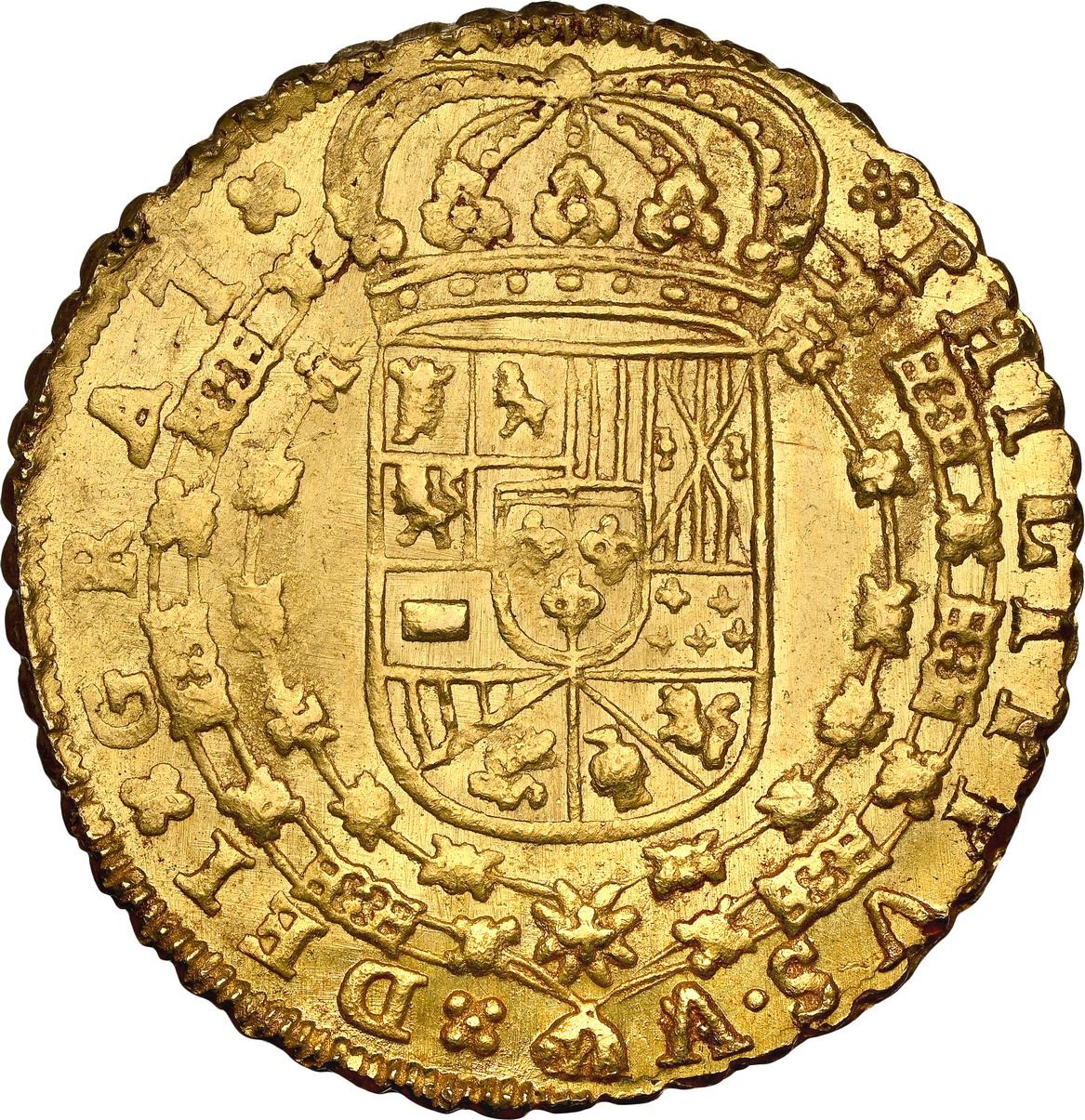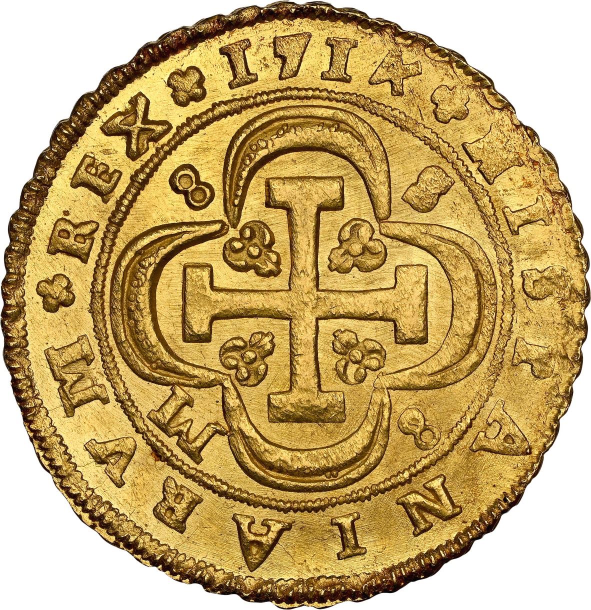 SPAIN, Seville, gold milled 8 escudos, Philip V, 1714 M, NGC MS 65, finest known in NGC census. Cal-2284; KM-260; Fr-247. A very lustrous and pristine coin with satin-smooth fields and razor-sharp details indicative of not just careful preservation but also likely from the first few strikes with fresh dies, also fairly well centered with full reverse rim and most of the obverse rim, among the top 2% of NGC-graded coins of ALL Spanish 8 escudos (all types, 1600s to 1800s), an exceptional trophy with the look of a specially prepared and immaculately preserved time capsule that avoided 300 years of outside contact.