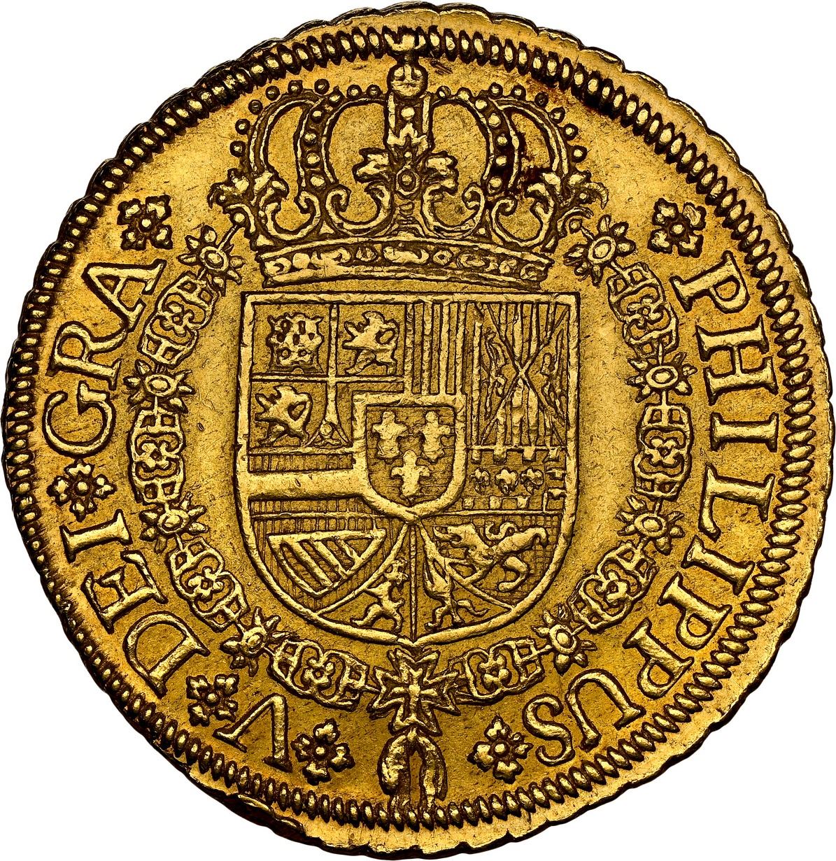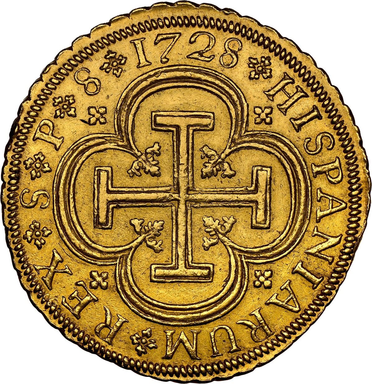SPAIN, Seville, gold milled 8 escudos, Philip V, 1728 P, very rare, NGC AU 58, "top pop," ex-Segarra. Cal-2301; KM-315; Fr-247. Broad flan extending past outer border in places, choice full details with undisturbed surfaces, lightly toned over muted luster, minimal high-point wear, tied with one other for finest in the NGC census. Pedigreed to the Fernando Segarra Collection (stated on label).