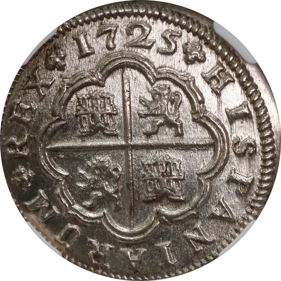 SPAIN, Seville, milled 2 reales, Philip V, 1725 J, NGC MS 64. Cal-983; KM-307. Exceptionally lustrous and bold, with all details full and choice, part of flan extending beyond the outer border on reverse, near top grade, very flashy.