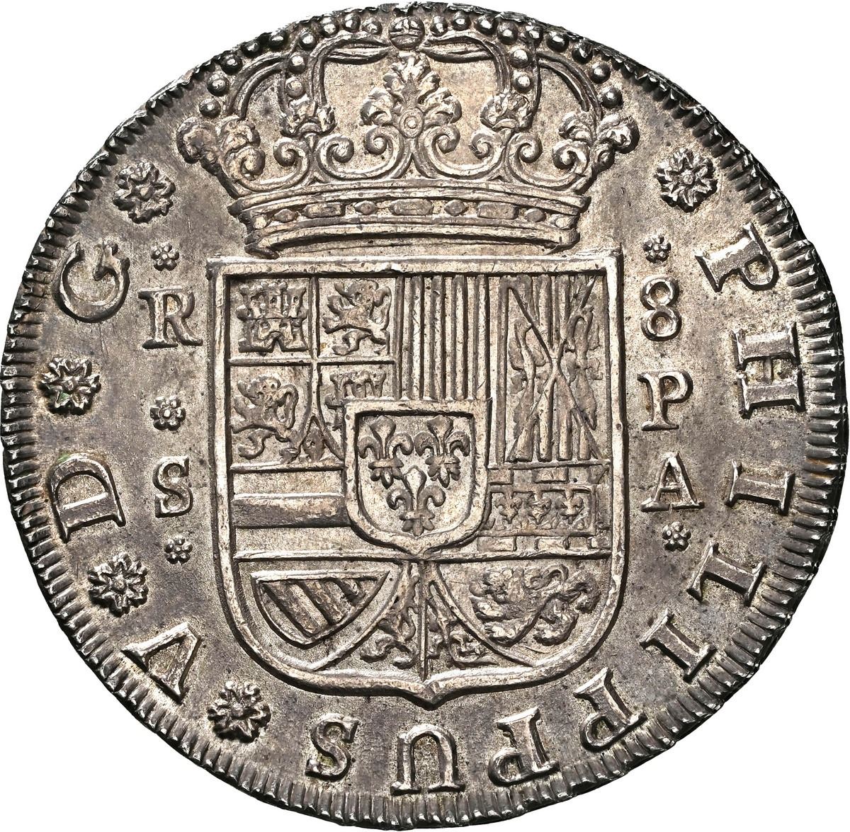 SPAIN, Seville, milled 8 reales, Philip V, 1732/1 PA, very rare overdate, NGC MS 63, finest known in NGC census, ex-Trastámara. Cal-1624; KM-unl (358 for type). An important and elusive early milled 8 reales of Philip V, struck at Seville during the opening phase of Bourbon monetary reform. The clear 1732/1 overdate, unlisted in KM and absent from even advanced collections, reflects the practical realities of early milled production, where dies were reworked during a period of rapid transition and standardization.
