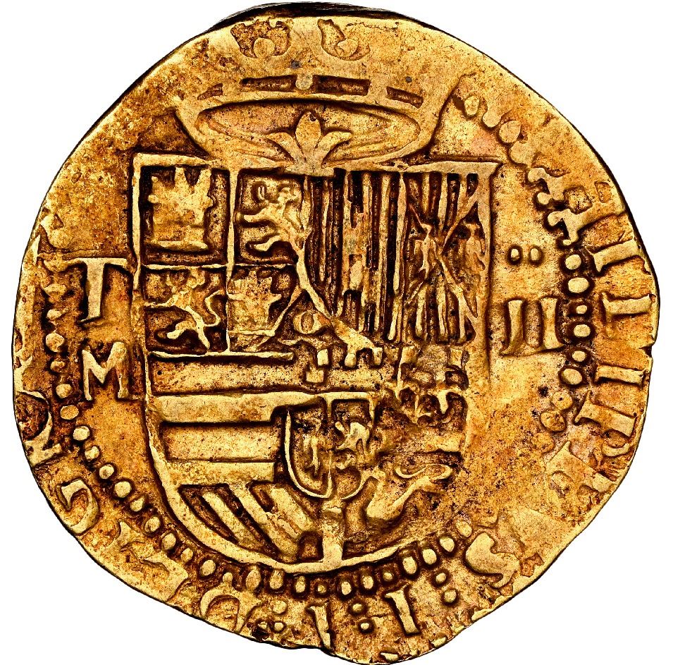SPAIN, Toledo, gold cob 2 escudos, Philip II, assayer M below mintmark T (no o) to left, denomination II below dots to right, NGC AU 55. Cal-unl; Fr-170. 6.69 grams. Very richly red-toned example on a perfectly round and even flan with good full shield and cross and much legend and crown, the mintmark T without o above oddly unlisted in Calicó(note the NGC label and census show Ferdinand-Isabel 1476-1516 in error).