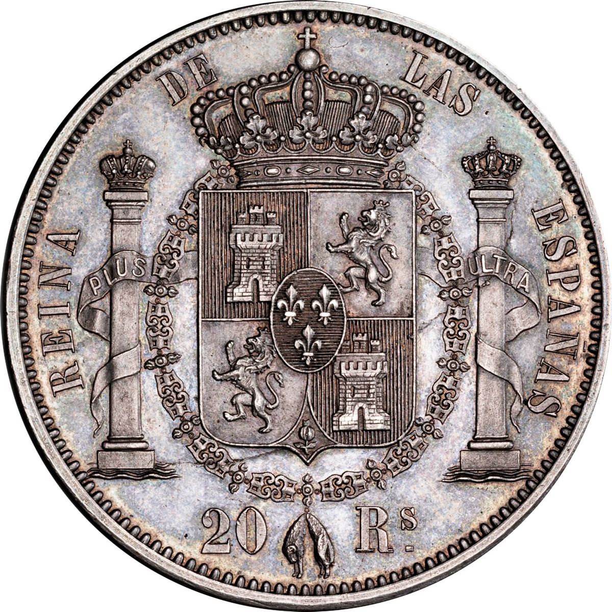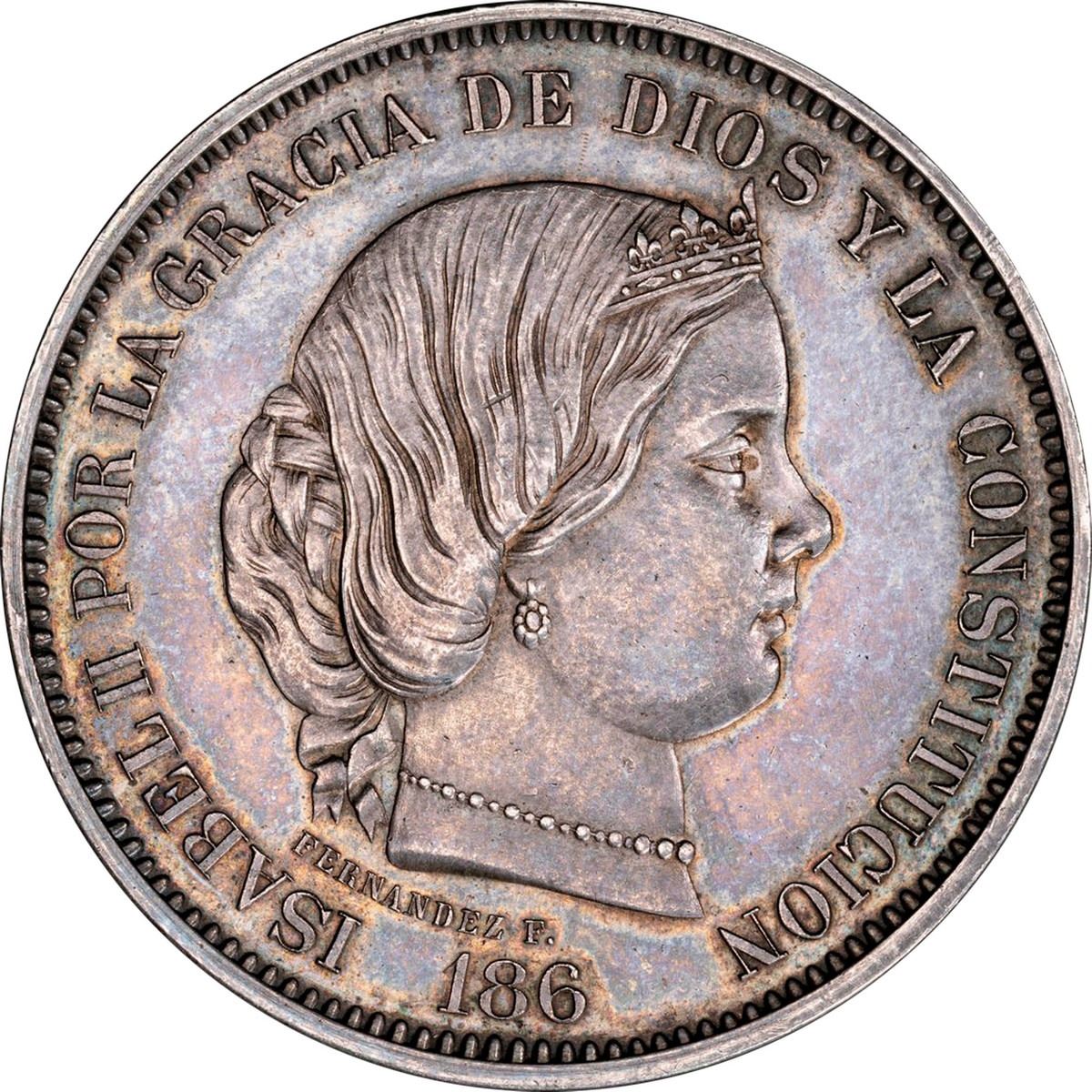 SPAIN, pattern 20 reales, Isabel II, 186_, second type, by Eduardo Fernández Pescador, rare, PCGS SP