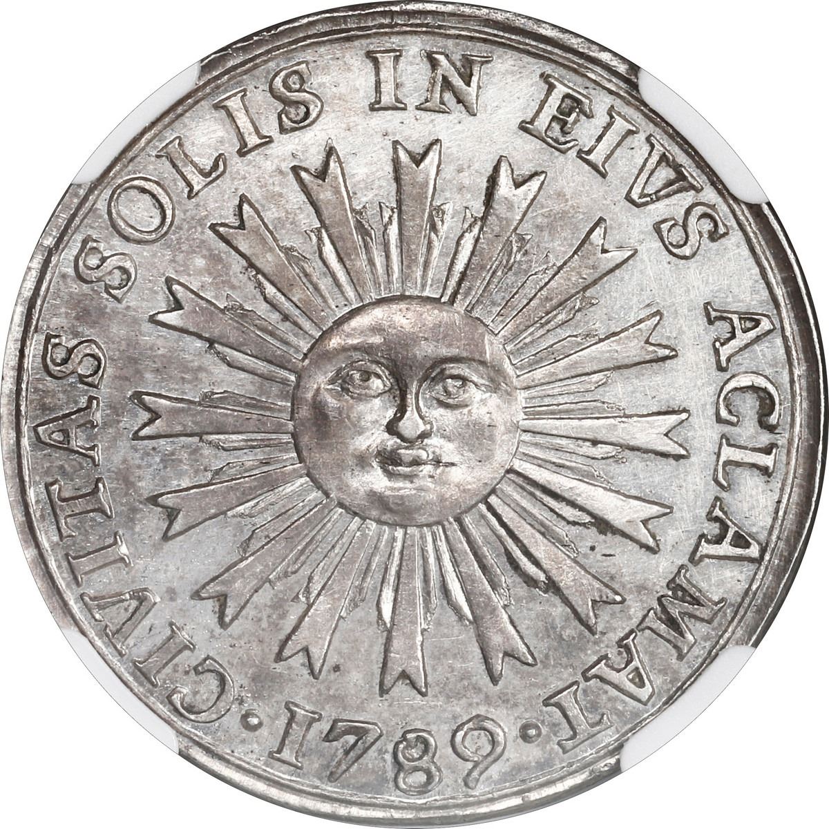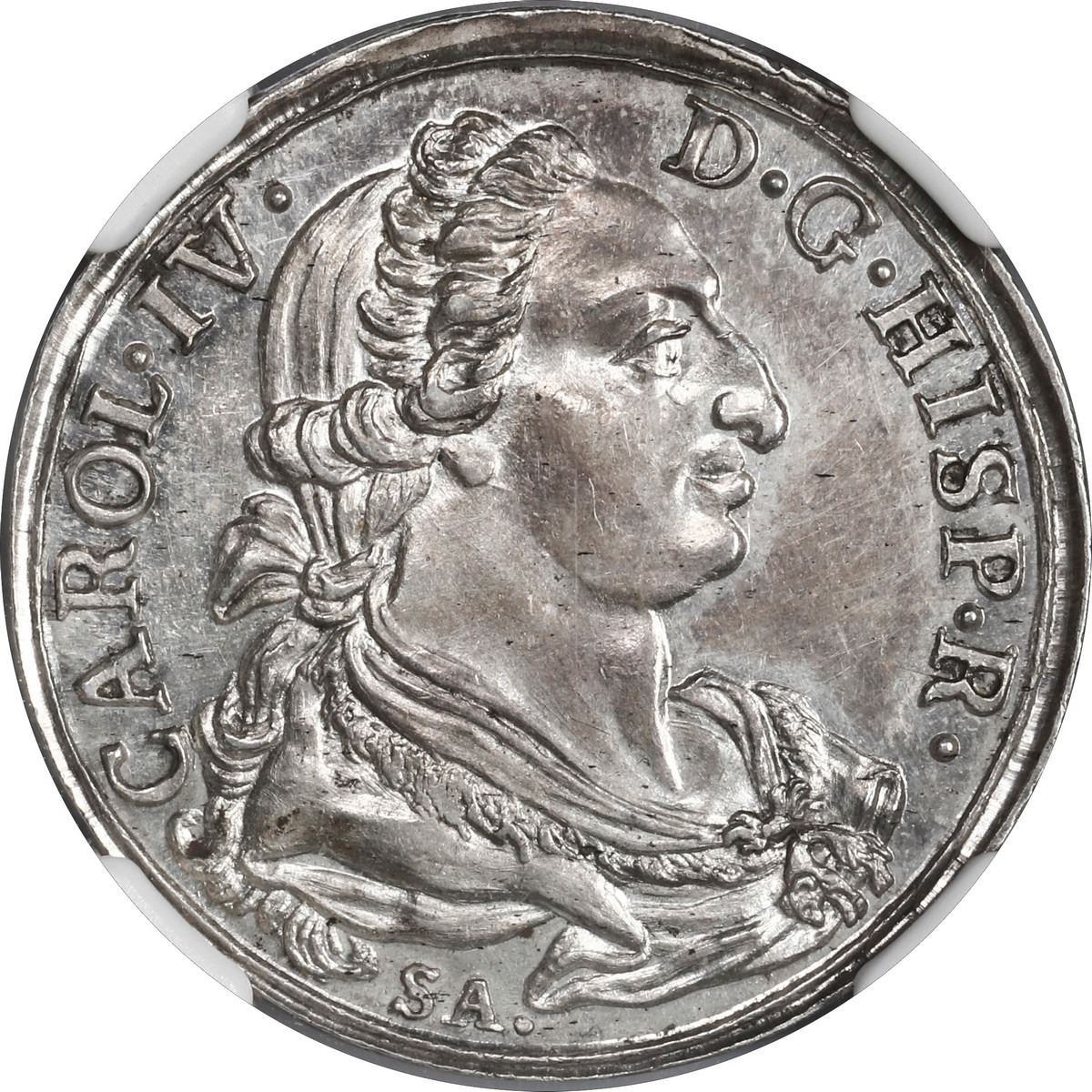 SPAIN, silver proclamation medal, 1789, Charles IV, College of Saint Thomas Aquinas (Madrid), unique reverse, NGC MS 61. Herrera-unl (cf 97/98). 26 mm. Obverse with right-facing bust of king within legend CAROL•IV• / D•G•HISP•R•, SA. below; reverse with sunface and rays within legend CIVITAS SOLIS IN EIVS ACLAMAT, date •1789• below, plain edge. Brightly lustrous, choice bold strike, faint surface hairlines on obverse. Note: Slab label says "Herrera-97obv / 98rev," but the reverse is not the same as Herrera-98, just has the same central design (sunface) with different legend.