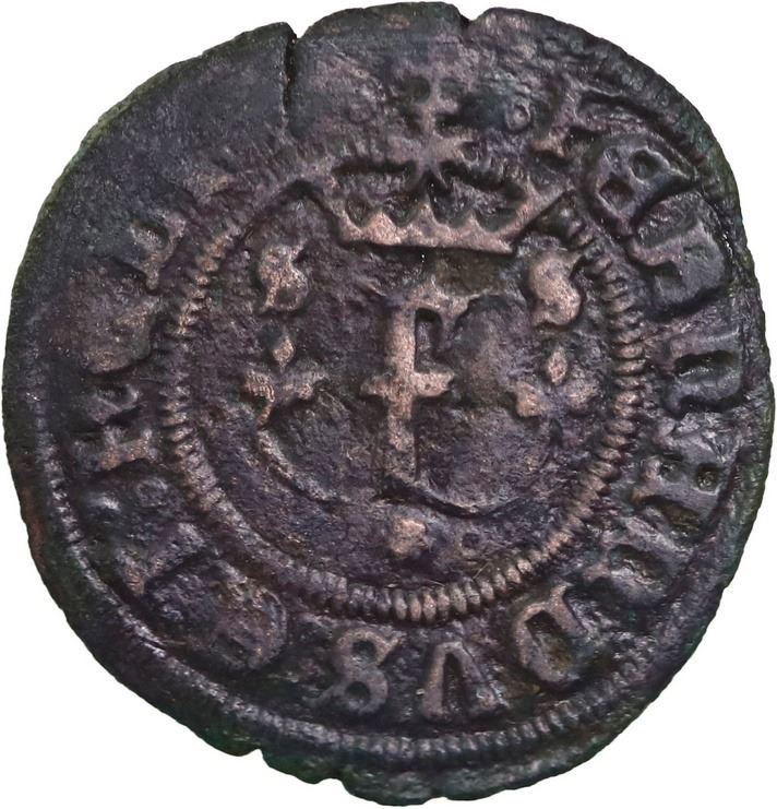 SPAIN (special issue for New World use), Seville, copper 1 maravedí, Ferdinand-Isabel, * at bottom, S above flukes crowned F with * at bottom, S above each fluke, FY on reverse, rare. Cal-unl (cf 62). 1.77 grams. Broad flan with great full legends (one small edge-split) that begin on the crowned-F side (not the FY side as indicated in Calicó), the inner details also full, overall toned XF with surface oxidation, high points lighter in color.