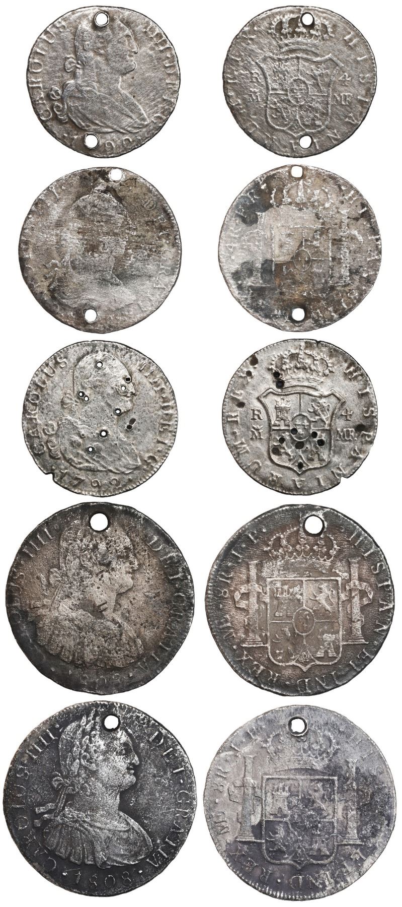 SPANISH COLONIAL (and SPAIN), various mints, lot of five bust 8R and 4R, various kings. 69.67 grams total. Both of the 8 reales are from Lima while the 4 reales consist of Potosí and Madrid coins; all are corroded, four are holed and the fifth coin has numerous pockmarks.