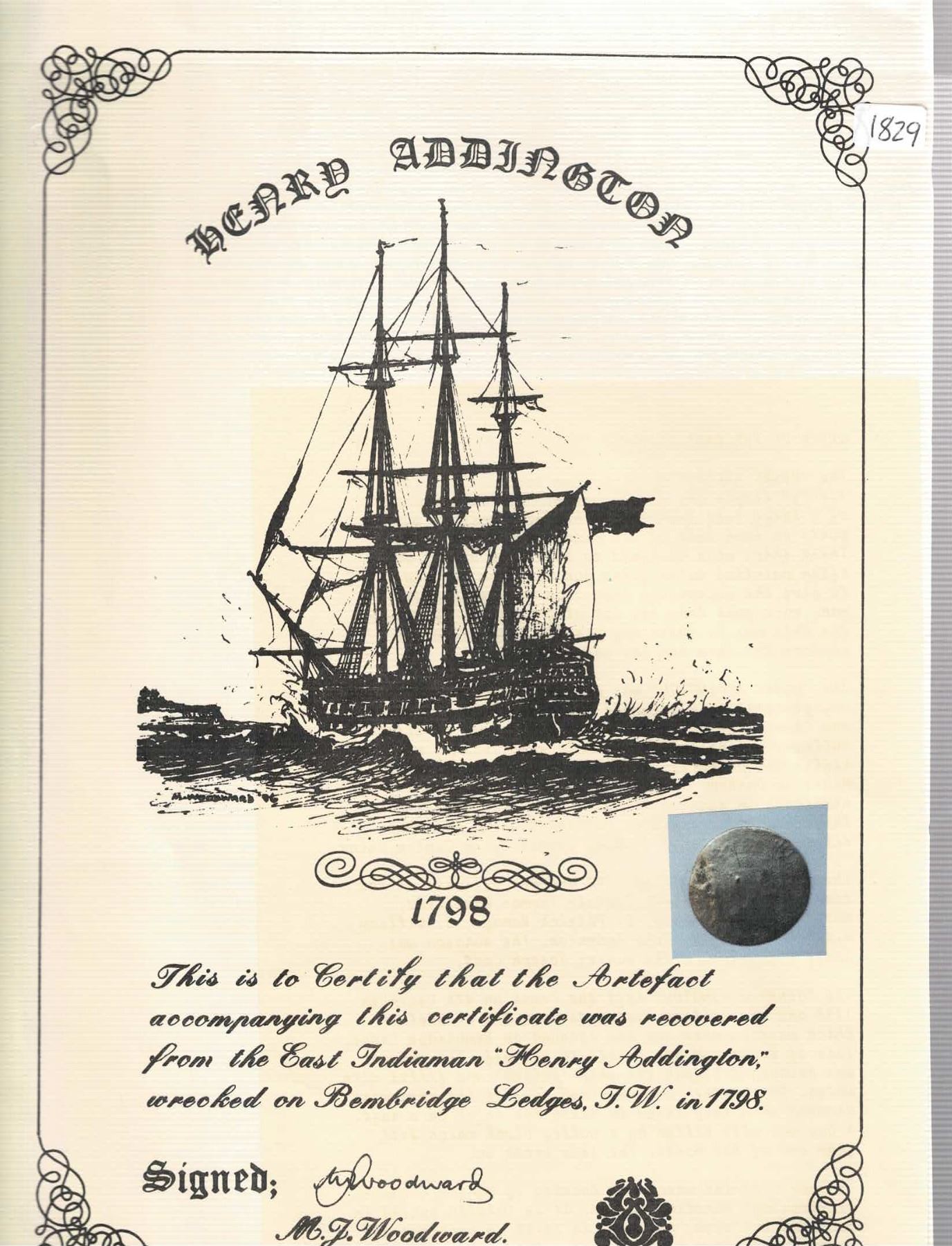 SPANISH COLONIAL, mint uncertain, bust 8 reales, Charles IV, 1796?, assayer not visible, rare provenance. 10.30 grams. Smoothed surfaces from corrosion with faint detail, rare provenance (see lot 1827 for a brief write-up on the ship). With original photo-certificate from the salvor. Recovered from: Henry Addington, sunk in 1798 off the Isle of Wight, south of England
