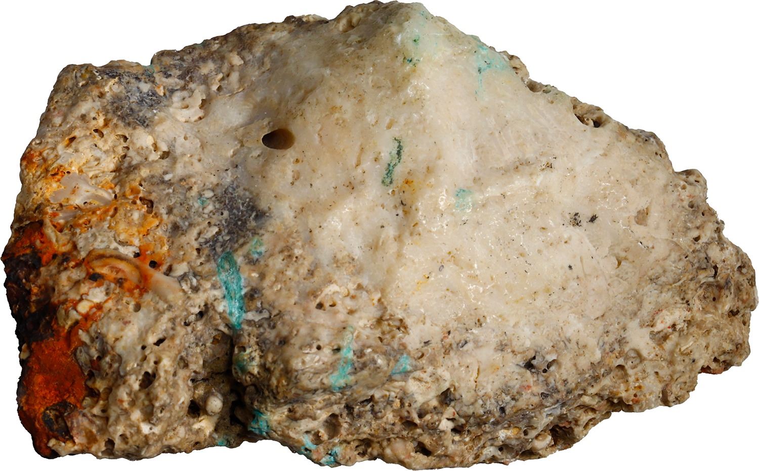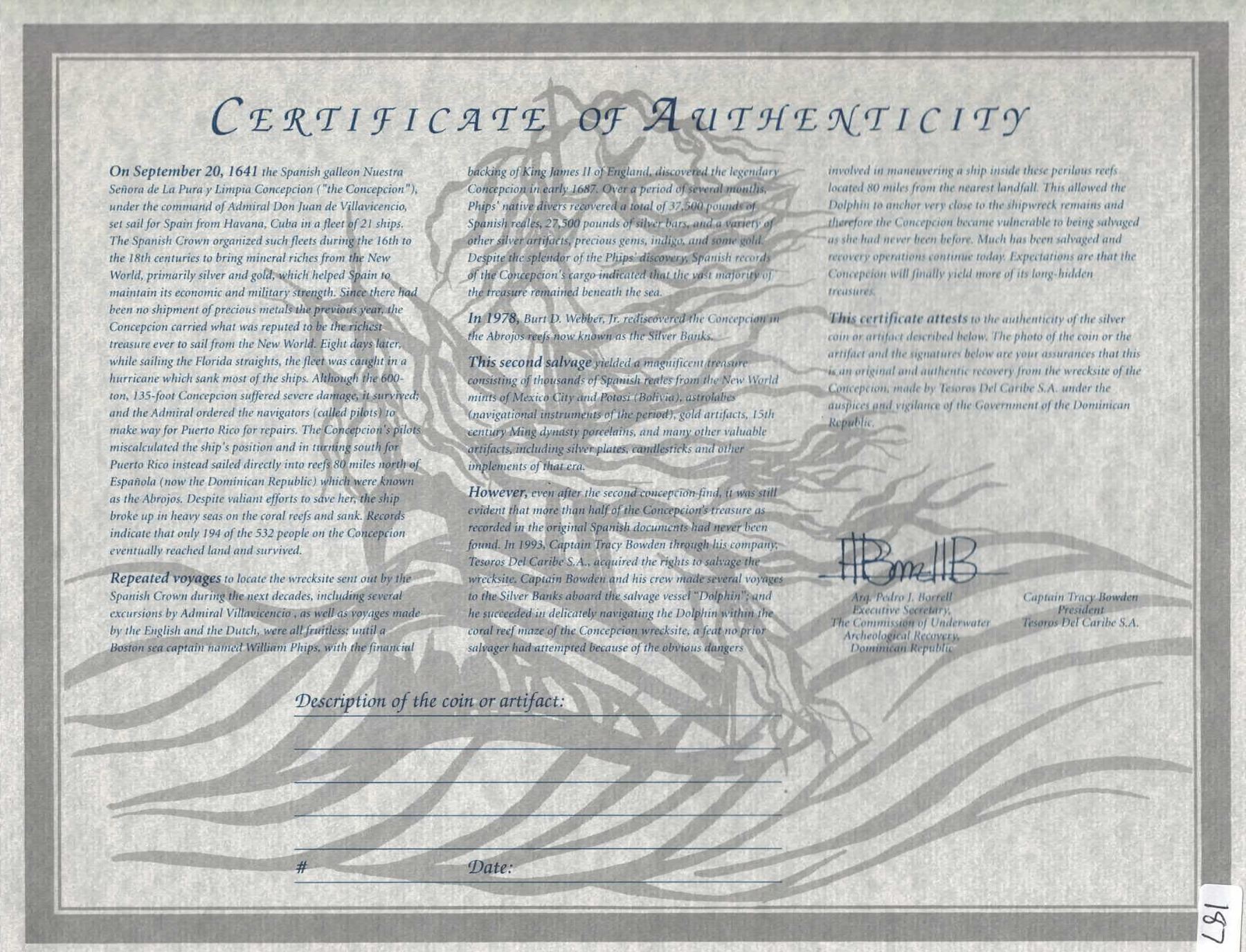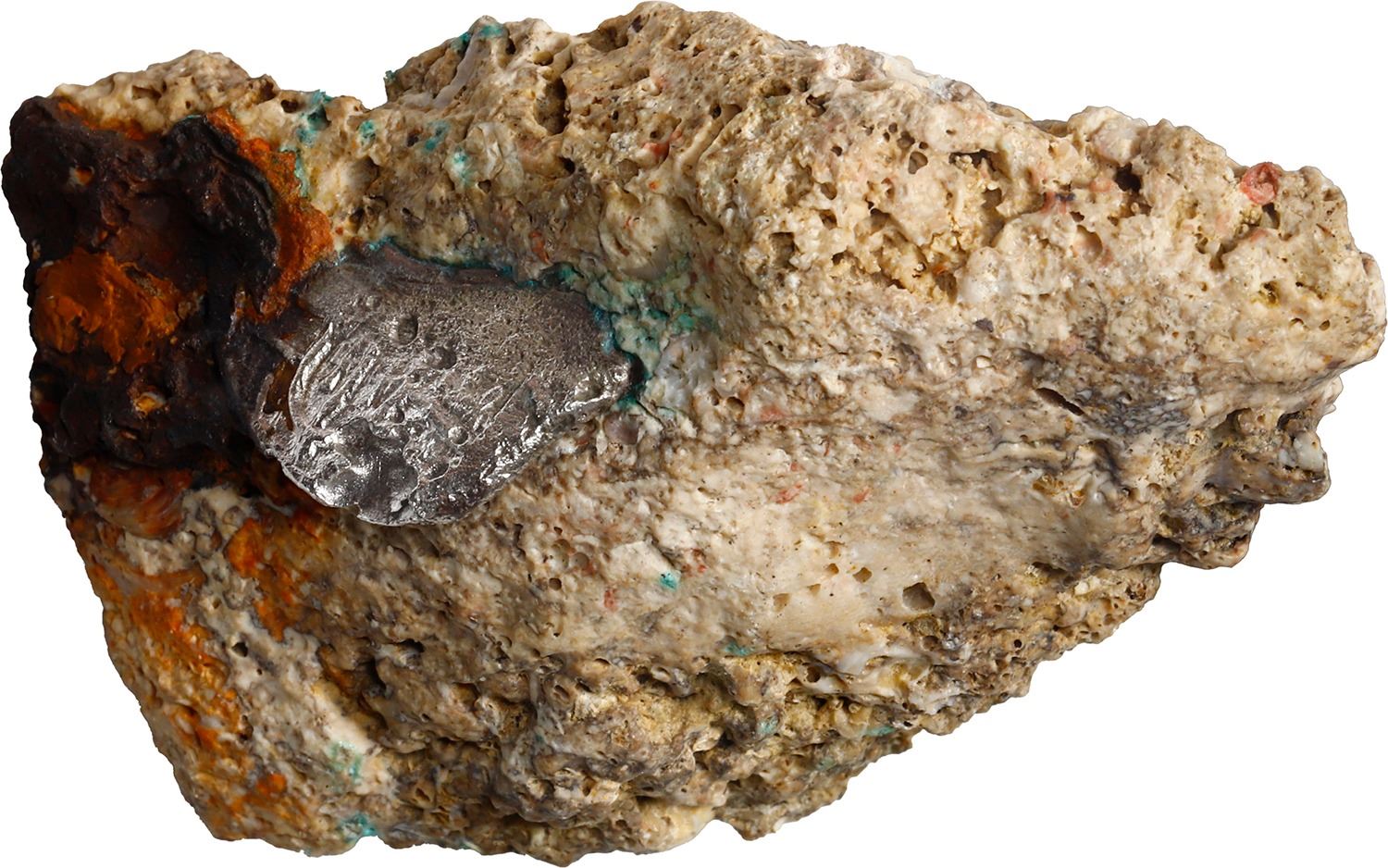 SPANISH COLONIAL, mint uncertain, clump of one cob 4 reales fragment in mass of coral with rock and iron. 64.25 grams total. Roughly 2¾" x 1¾" x 1". Solid, compact clump with a single silvery cob sticking out on top showing off some partial shield detail next to a chunk of rusted iron. With original certificate from Captain Tracy Bowden through his contract with the Dominican Republic. Recovered from: Concepción, sunk in 1641 off Hispaniola