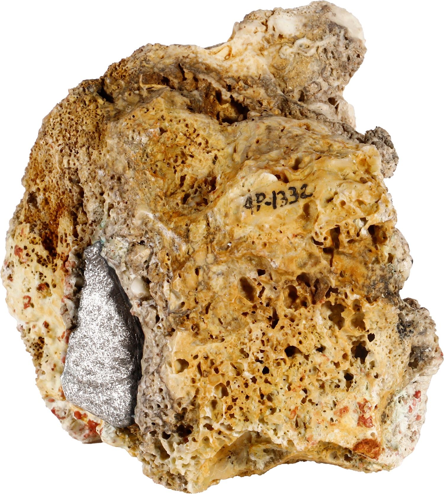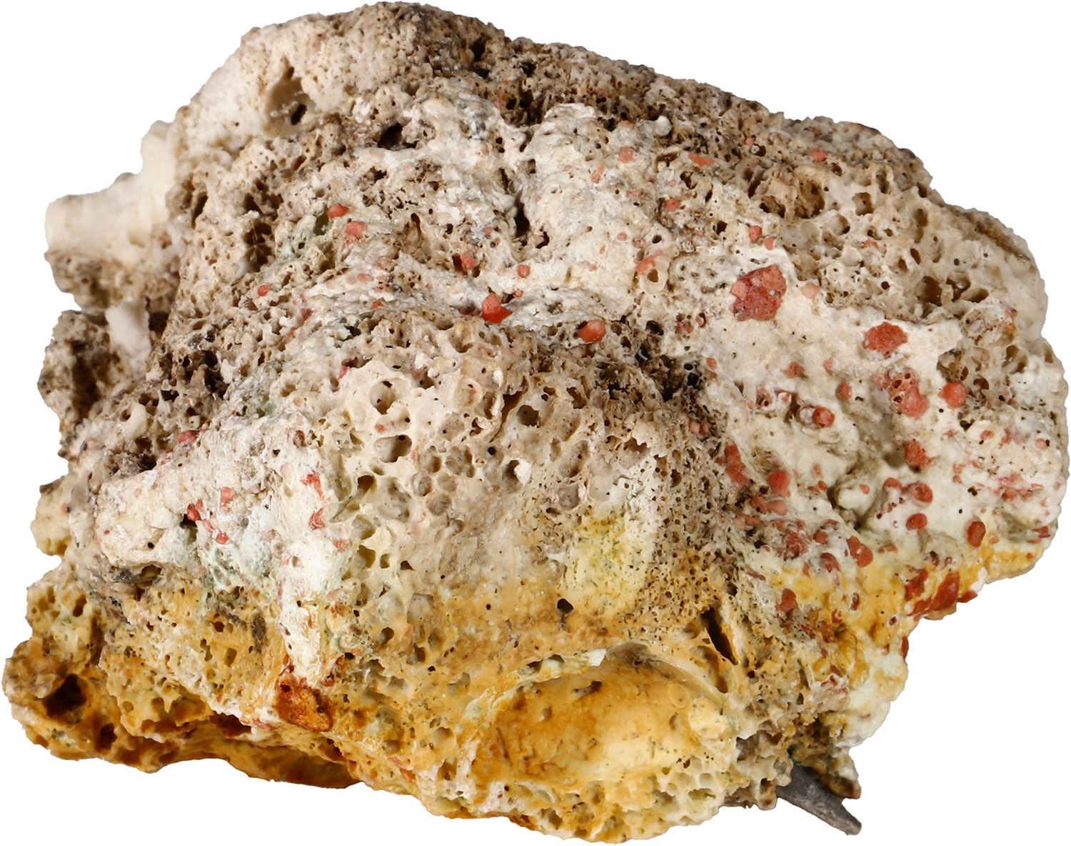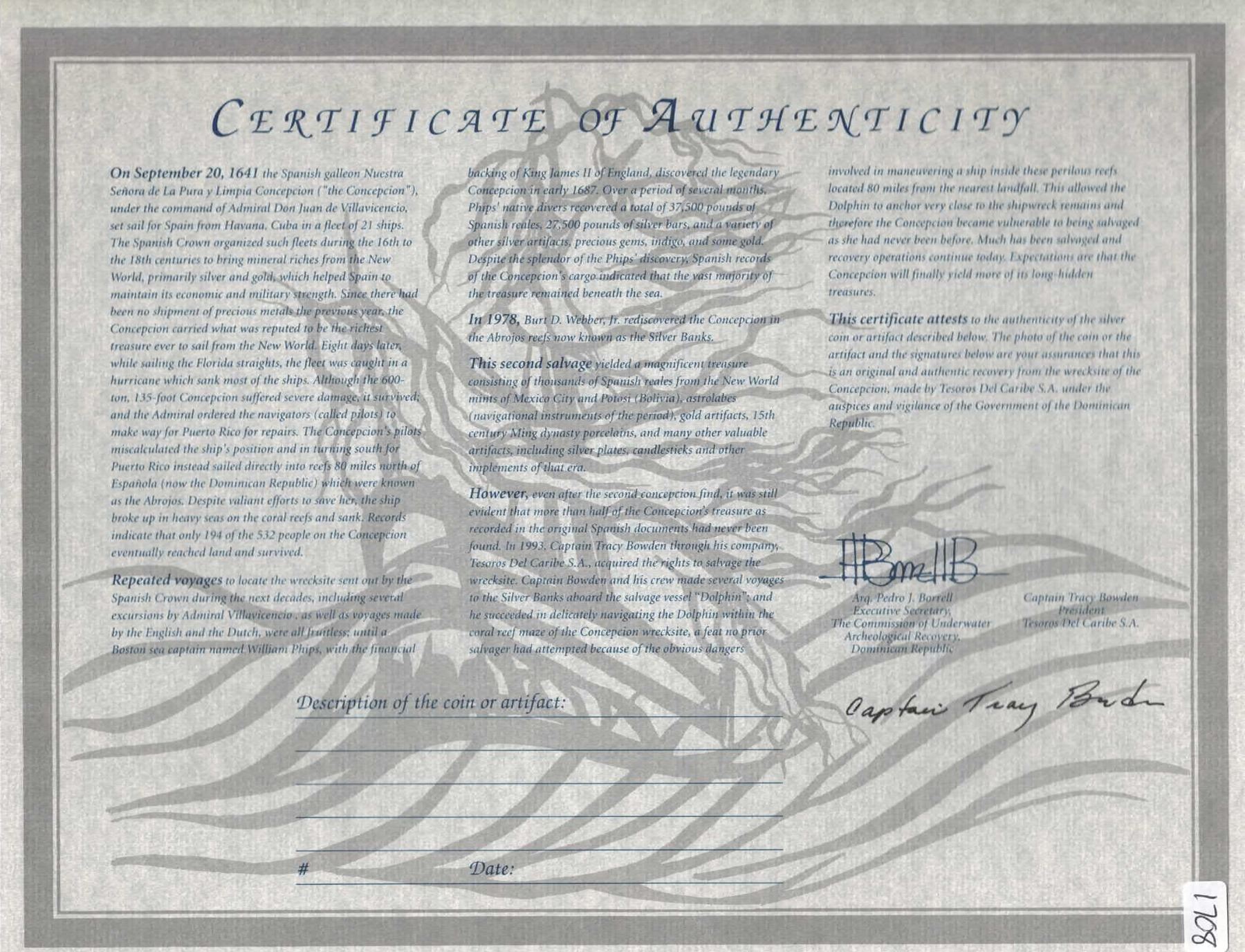 SPANISH COLONIAL, mint uncertain, clump of one cob 8 reales in large mass of coral. 297 grams total. 3¼" x 3" x 2¼". Neat, baseball-sized chunk of porous tan and white coral with part of a corroded cob sticking out of the top. With original certificate from Captain Tracy Bowden through his contract with the Dominican Republic. Recovered from: Concepción, sunk in 1641 off Hispaniola