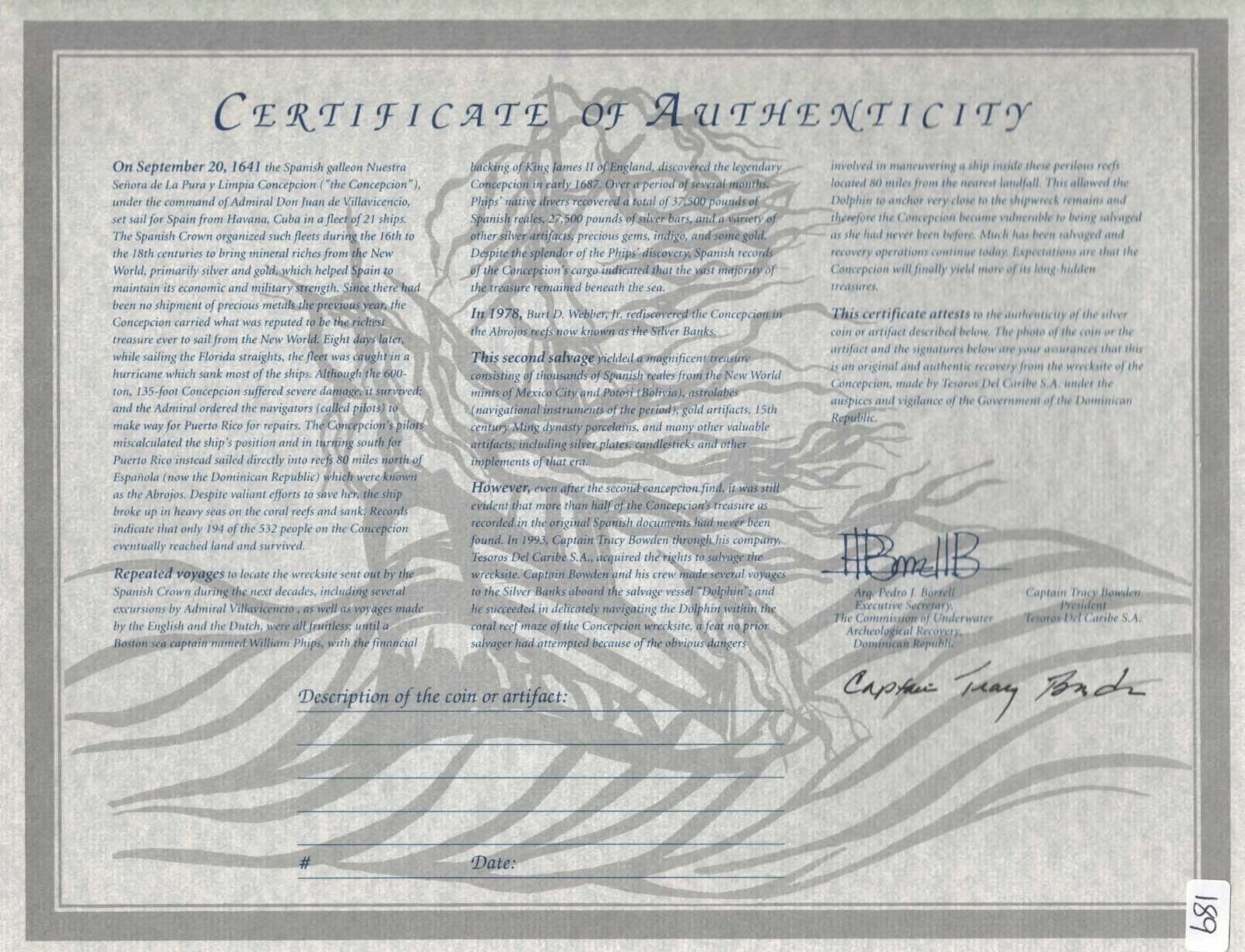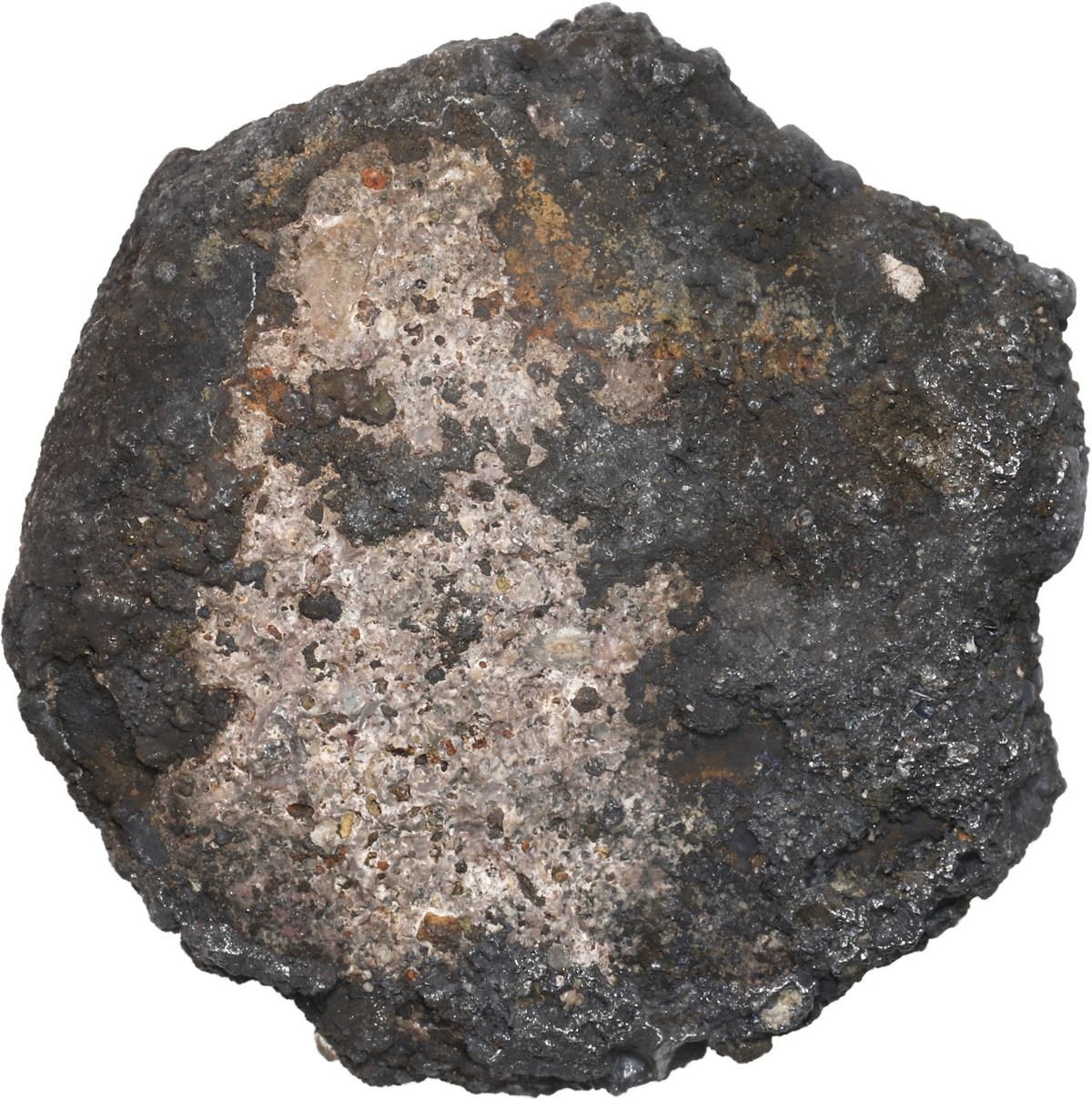 SPANISH COLONIAL, mint uncertain, cob 4 reales "biscuit," oxidized and encrusted (as found). 17.17 grams. Nearly octagonal piece with very puffy black oxidation all over, some small debris and a light-gray patch on one side. With original certificate from Captain Tracy Bowden through his contract with the Dominican Republic. Recovered from: Concepción, sunk in 1641 off Hispaniola