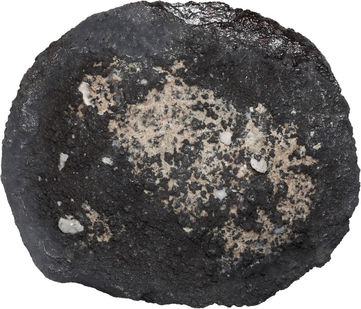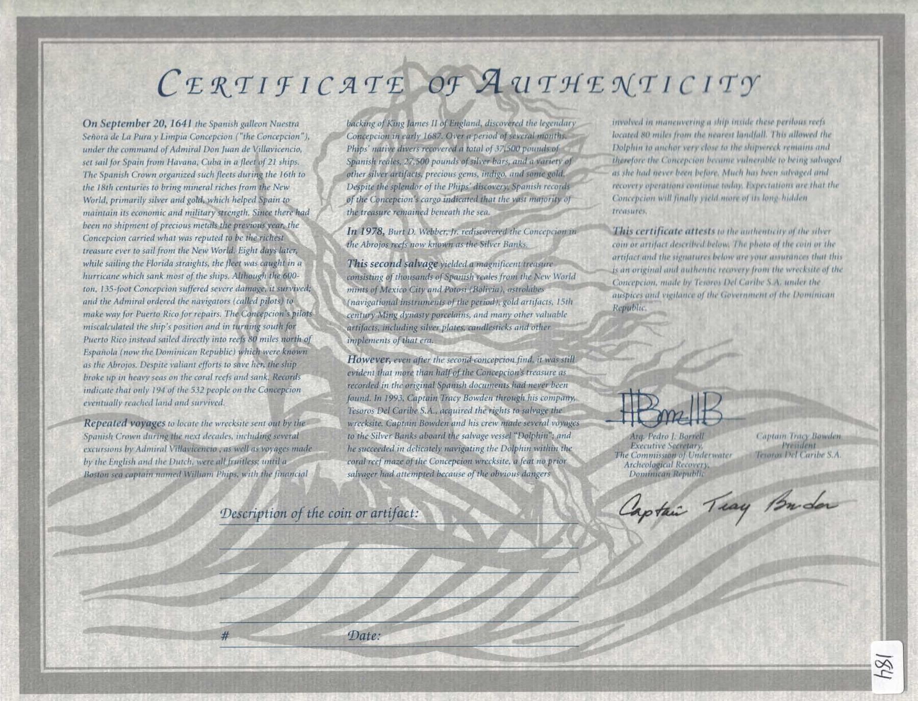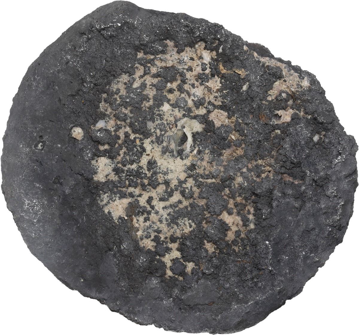 SPANISH COLONIAL, mint uncertain, cob 8 reales "biscuit," oxidized and encrusted (as found). 26.58 grams total. Thick black oxidation impregnated on both sides with tiny whitish shell-bits and other debris, small part of thin edge of coin exposed. With original certificate from Captain Tracy Bowden through his contract with the Dominican Republic. Recovered from: Concepción, sunk in 1641 off Hispaniola