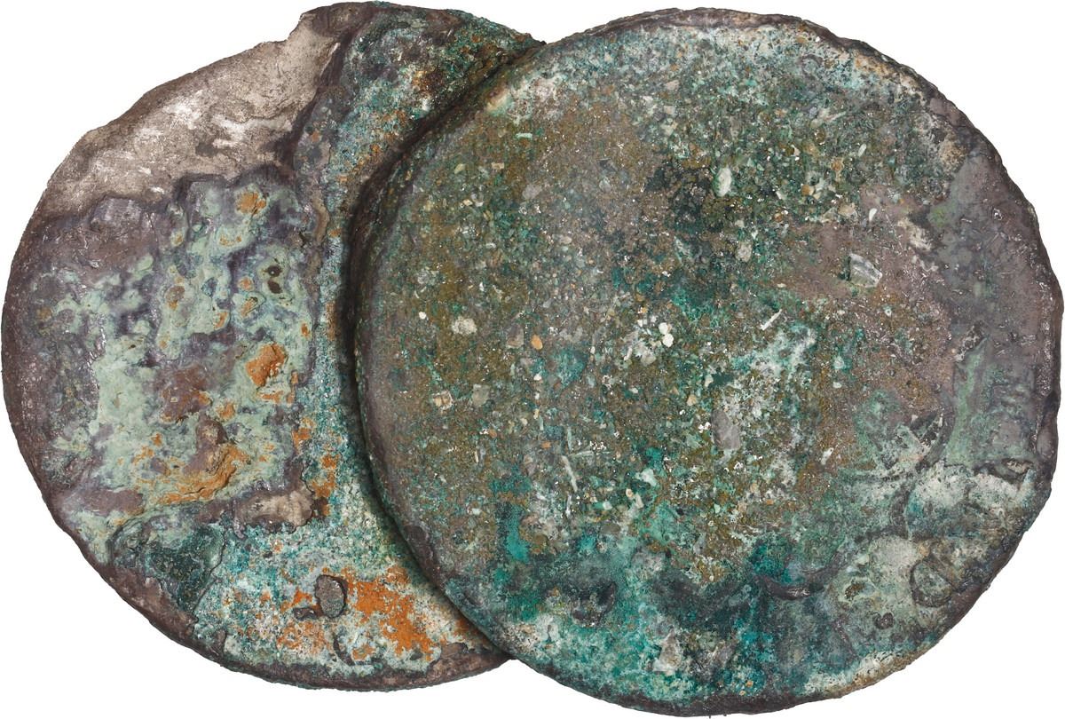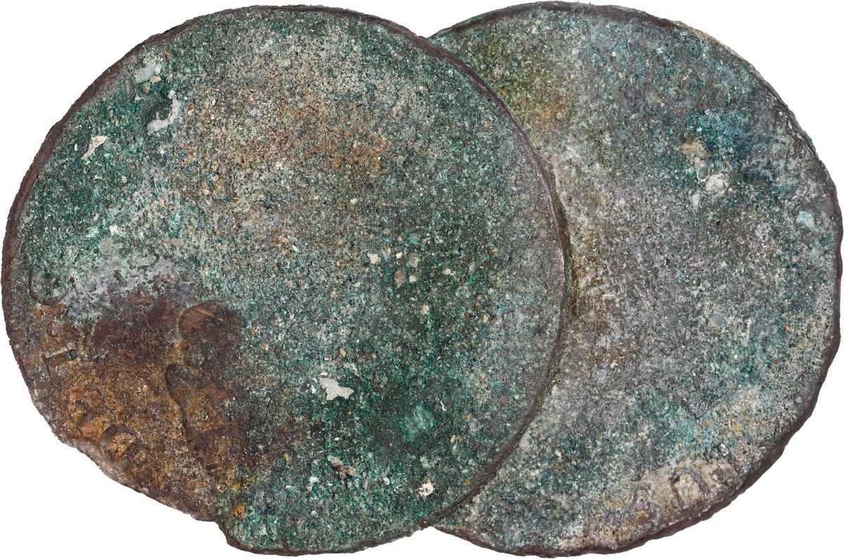 SPANISH COLONIAL, mints uncertain, clump of two bust 8 reales, Charles IV, dates not visible, assayers not visible, encrusted as found. 48.42 grams total. Pair of corroded yet solid coins clumped together with green sedimentation, each showing off a little design detail (both probably 1800-dated Lima pieces). Pedigreed to Sedwick Auction 24, with original lot-tag 629. Recovered from: Santa Leocadia, sunk in 1800 off Punta Santa Elena, Ecuador