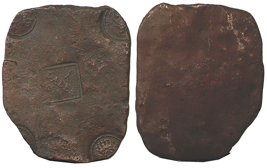 SWEDEN, Avesta mint, copper 1 daler "plate money", Karl XII, 1715. KM-PM38. 541 grams. 5½" x 4½". Scarcer early type with square central stamp (nearly full), four partial corner stamps despite moderate corrosion and wear. With original certificate from the salvor/conservator. Recovered from: Nicobar, sunk in 1783 off South Africa