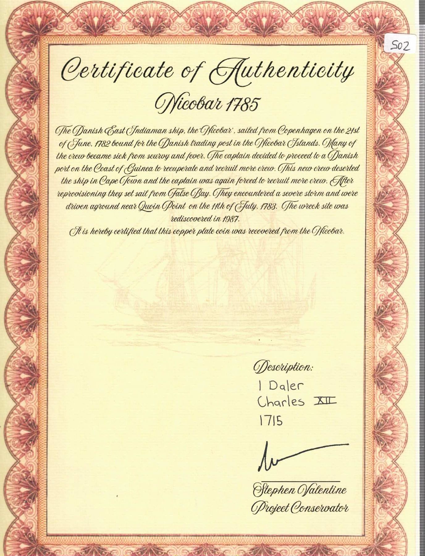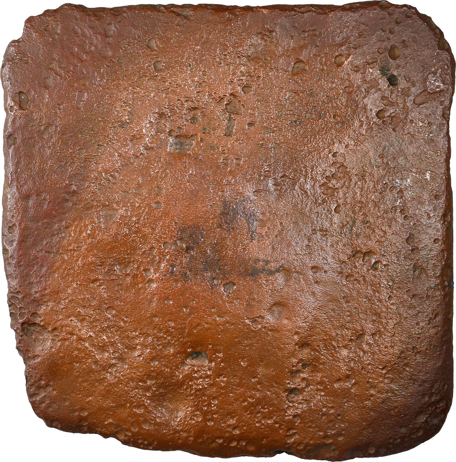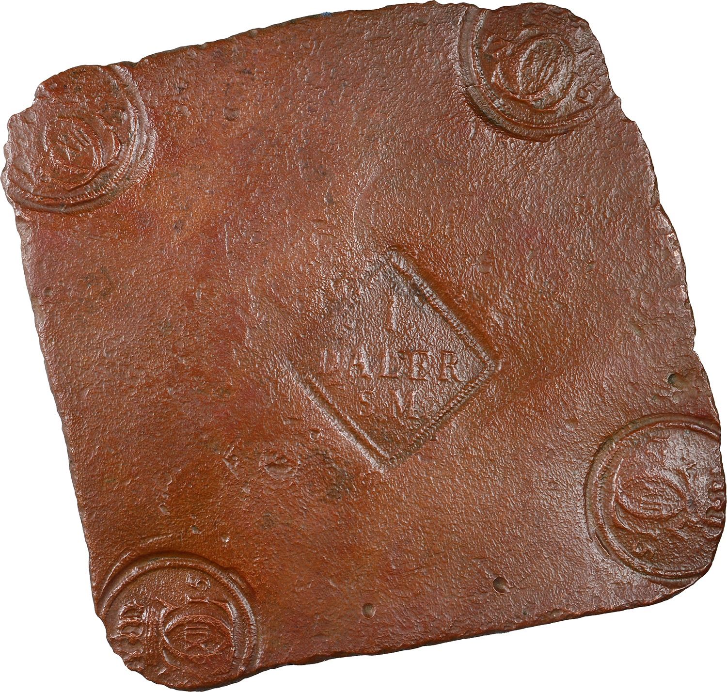 SWEDEN, Avesta mint, copper 1 daler "plate money," Karl XII, 1715. KM-PM38. 558 grams. Roughly 5¼" x 5". Scarcer early type with square central stamp (nearly full), four partial yet nice corner stamps despite moderate corrosion and wear, even chocolate brown coloration. Pedigreed to the Steve Valentine Collection, with original certificate from the salvor/conservator. Recovered from: Nicobar, sunk in 1783 off South Africa