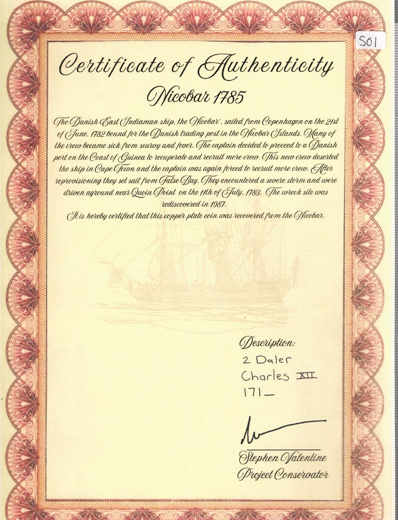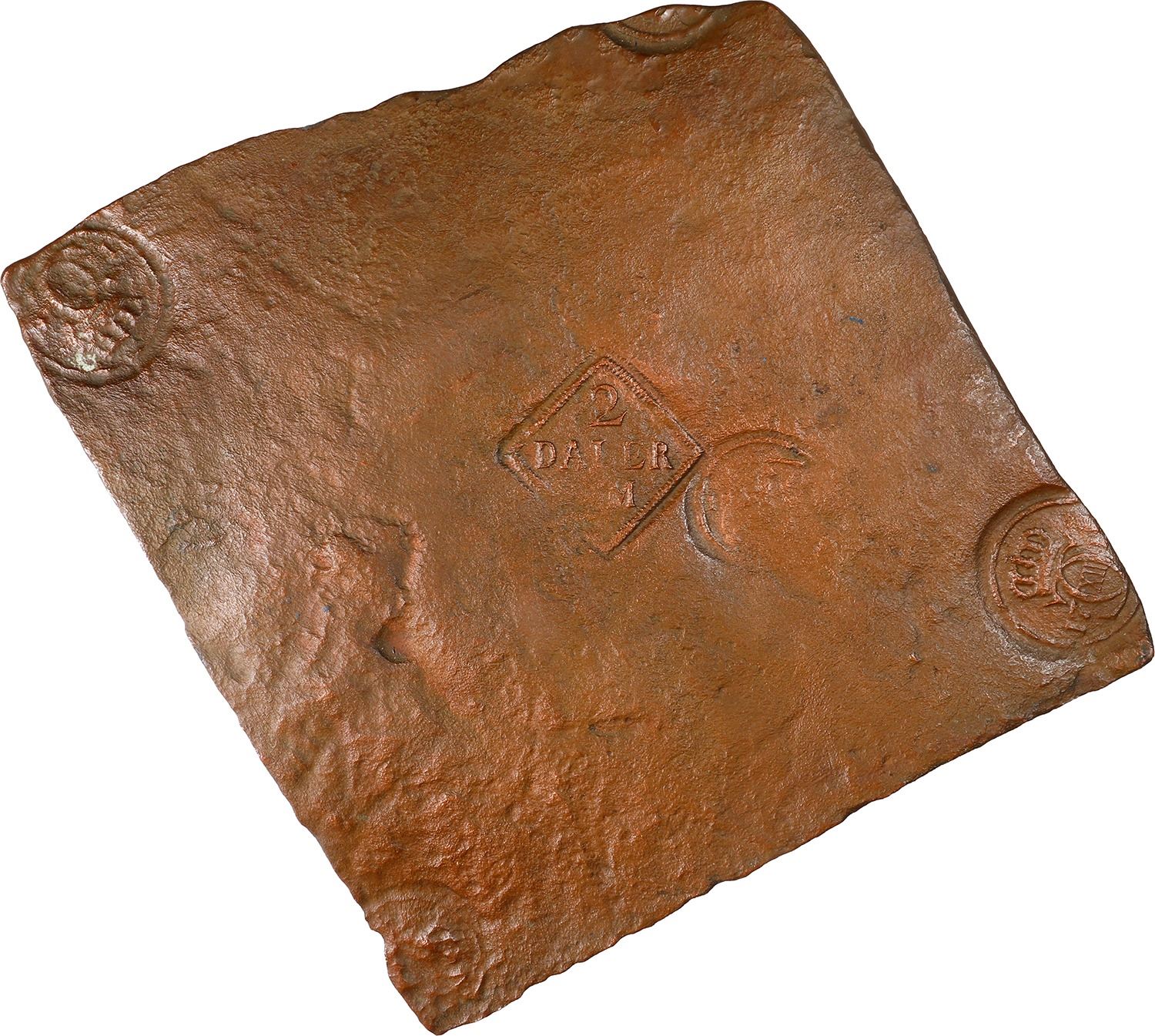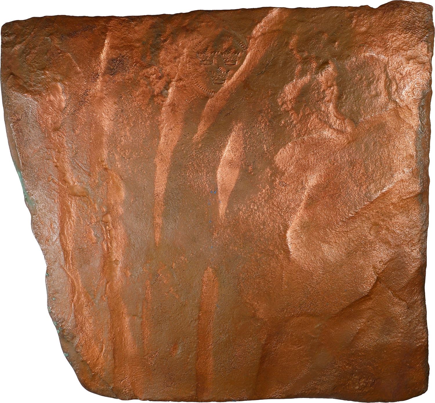 SWEDEN, Avesta mint, copper 2 daler "plate money," Karl XII, 1716, with 1718-dated Type A countermark (Gothenburg) next to center stamp and three crowns countermark on back. KM-PM46. 1121 grams. Roughly 7½" x 7". Rare, earlier-dated piece from this wreck with a weak but certain Gothenburg countermark next to the diamond-shaped center stamp, corroded along the edges with weak corner stamps yet with one showing just enough of the date, the back side rather nice and copper-red with clear three crowns countermark near the edge, the first example of this type from this wreck that we have offered at auction. Pedigreed to the Steve Valentine Collection, with original certificate from the salvor/conservator. Recovered from: Nicobar, sunk in 1783 off South Africa
