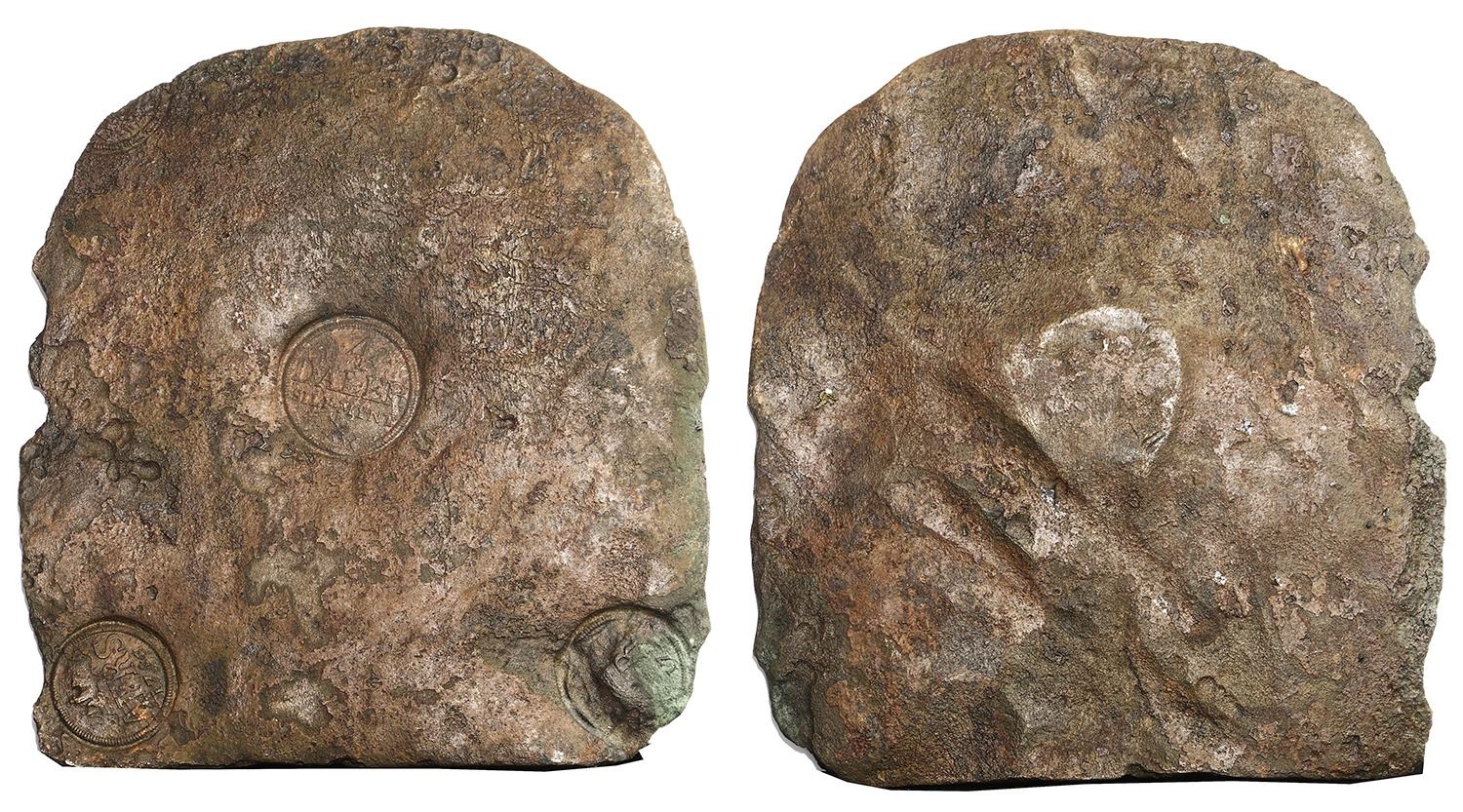SWEDEN, Avesta mint, copper 4 daler "plate money", Adolf Fredrik I, 1756. KM-PM76. 2311 grams. 9¾" x 9". Bold full central stamp and one corner stamp, another corner stamp also bold and deep but corroded and green-encrusted, the other corners corroded away, desirable as a large-denomination size. With certificate and booklet Copper Coins of Sweden / Coinage of Swedish Plate Money (1962) by O.P. Eklund / Berta Holmberg. Recovered from: Nicobar, sunk in 1783 off South Africa