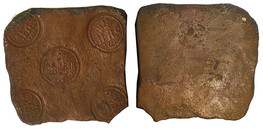 SWEDEN, Avesta mint, copper ½ daler "plate money", Adolf Fredrik I, 1751. KM-PM80. 342 grams. 4" x 3¾". Cute little piece with all five stamps clear (four dates) and only minor edge-loss from corrosion. With original certificate from the salvor/conservator. Recovered from: Nicobar, sunk in 1783 off South Africa. NOTE: Printed catalog shows the wrong ruler, date, and KM #.