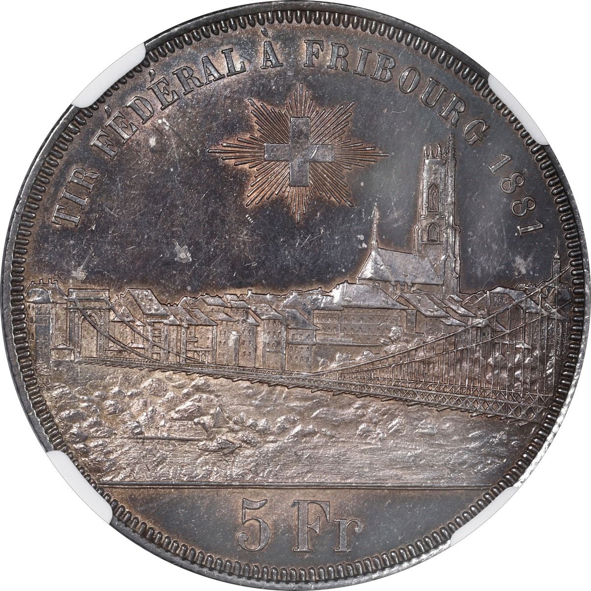 SWITZERLAND, Bern, 5 francs "shooting taler," 1881, Fribourg Shooting Festival, NGC MS 61.