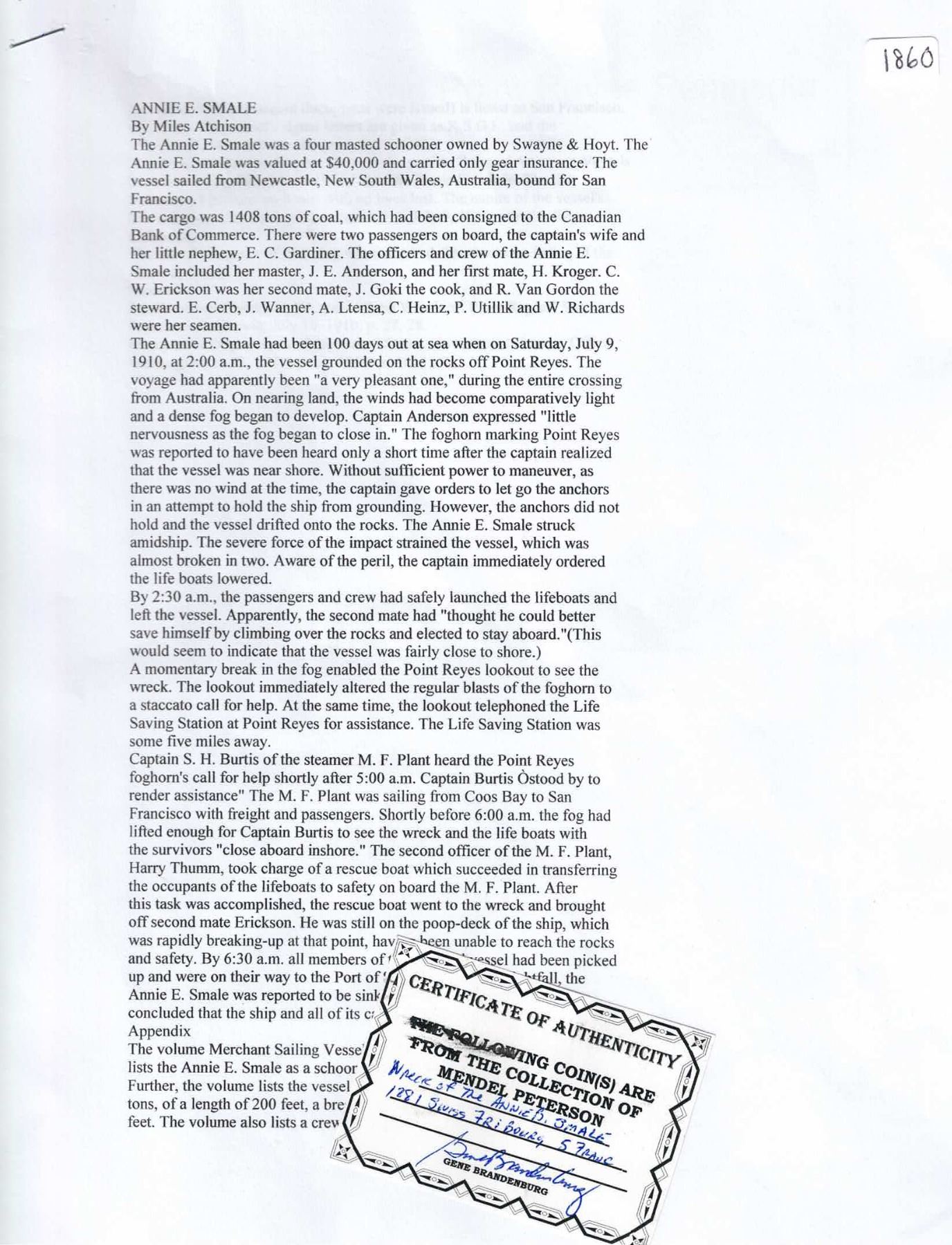 SWITZERLAND, Bern, 5 francs "shooting taler," 1881, Fribourg shooting festival, ex-Peterson. KM-S15. 25.01 grams. Among the most unusual coins that we've encountered from a shipwreck is this Swiss shooting taler recovered from the wreck of a coaling schooner driven onto rocks at Point Reyes in rolling seas and heavy fog, dived on by the famous adventurer and Smithsonian curator Mendel Peterson sometime in the 1950s-70s. XF with very light surface corrosion and black encrustation around the details. Pedigreed to the collection of the late Dr. Mendel Peterson (Curator of Underwater Archeology for the Smithsonian Institution), with original Brandenberg tag and information sheets. Recovered from: Annie E. Smale, sunk in 1910 off San Francisco, California