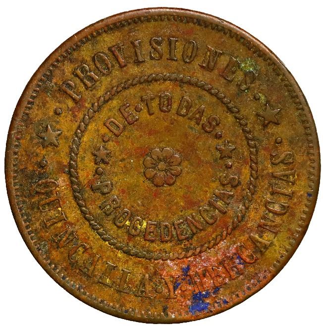 Sabana Grande, brass token, Calixto Carrera, late 1800s, very rare, ex-Roehrs. Fumero-123. 5.93 grams; 27mm. Obverse with * CALIXTO . CARRERA * / SABANA GRANDE . P.R around . * . PRECIOS . * . / EQUITATIVOS around eight-petal flower; reverse with . * . PROVISIONES . * . / QUINCALLA . Y. MERCANCIAS . around . * . DE TODAS . * . / PROCEDENCIAS around eight-petal flower. Dark red/olive AU with light encrustation all over. Established by future mayor Calixto Carrera, this token is for a warehouse business that appears in an 1894 directory. RR in Fumero. Pedigreed to the Edward Roehrs collection, with his tag 422.