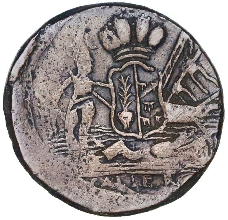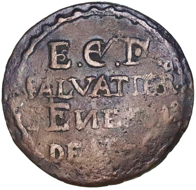 Salvatierra (Guanajuato), Mexico, bronze hacienda token (1/8 real?), 1805, rare. Rulau-Guj58; Grove-39; Eklund and Noe-23. 11.02 grams, 31mm Obverse with crowned arms above ALLER (or CALLE B?); reverse with E.Cv D. / SALVATIERRA / ENERO 1o / DE [1805]. Grove reads the date (not visible on this piece) as 1803. Typically crude and unevenly struck VF, very darkly toned, scarce example of necessary local "small change" in the absence of anything lower than 1/4 real being made at the Mexico City mint.