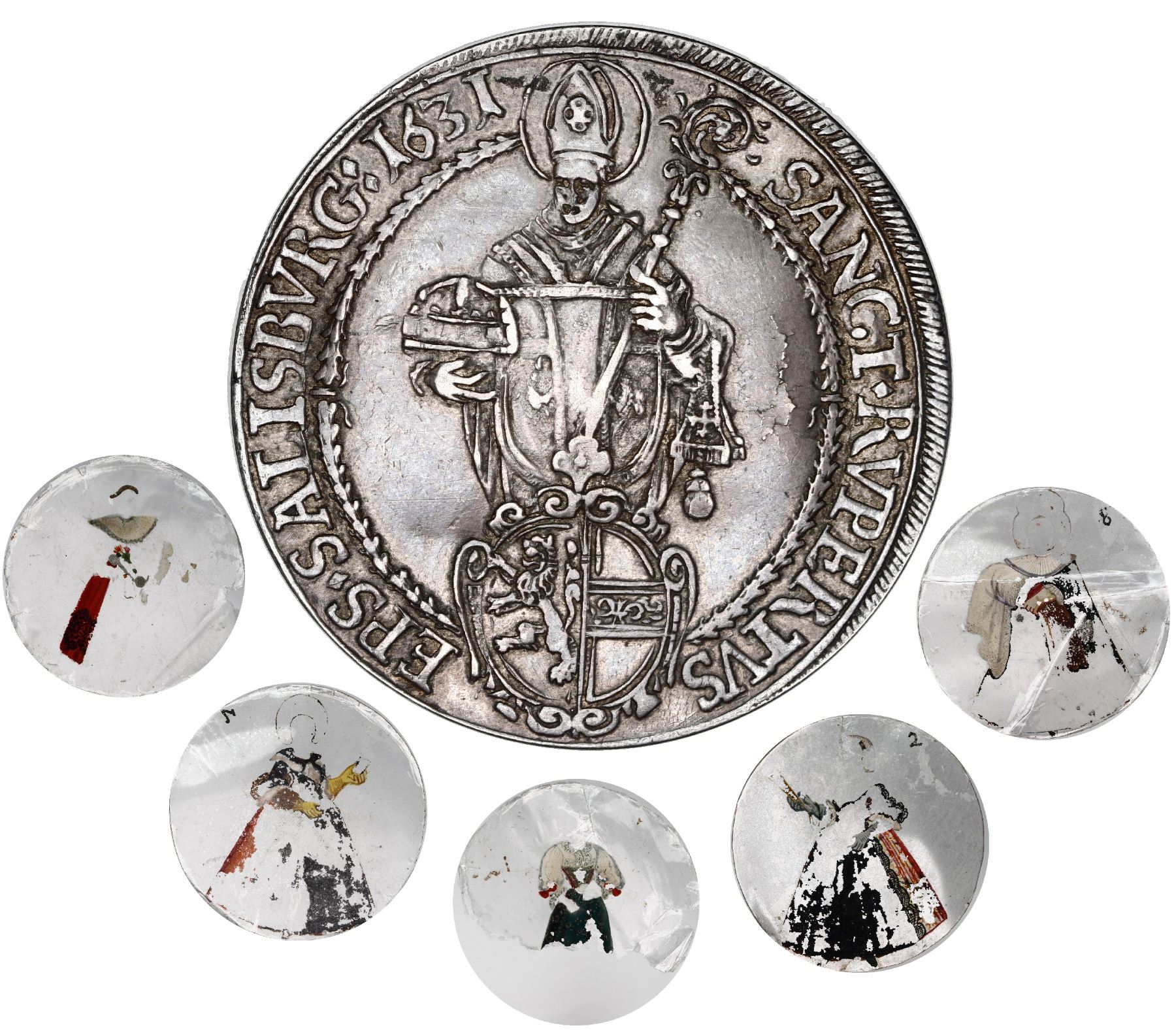 Salzburg, Austria (Holy Roman Empire), taler, Prince-Archbishop Paris von Lodron, 1631, made into a box taler with ten mica slides. KM-87; Dav-3504. 11.71 grams. Toned XF coin that was hollowed out and made into a box for holding clear mica discs painted with various full-length portraits (mostly women), in addition to two paper discs similarly painted and glued to the insides of the box, the mica discs in fair condition (well used)