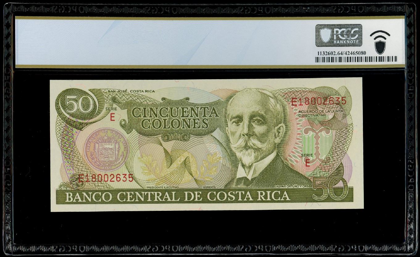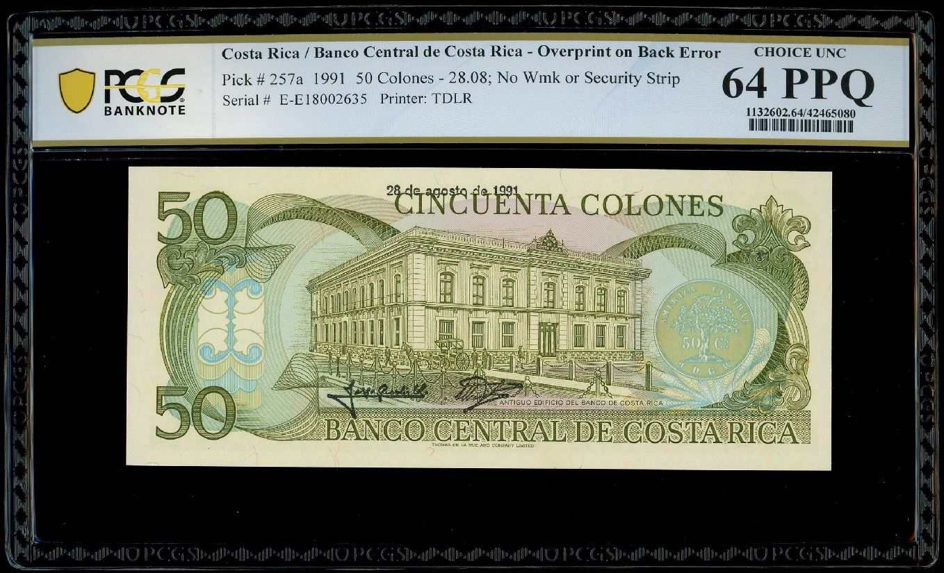 San Jose, Costa Rica, Banco Central, 50 colones, 28-8-1991, serial E18002635, overprint on back error, PCGS Choice UNC 64 PPQ. SCWPM-257a. The overprint on this error note is correctly oriented yet printed on the wrong side. Excellent paper quality and inking. PCGS #42465080. Pedigreed to the Tamarindo Collection of Costa Rican Error Coins and Paper Money.