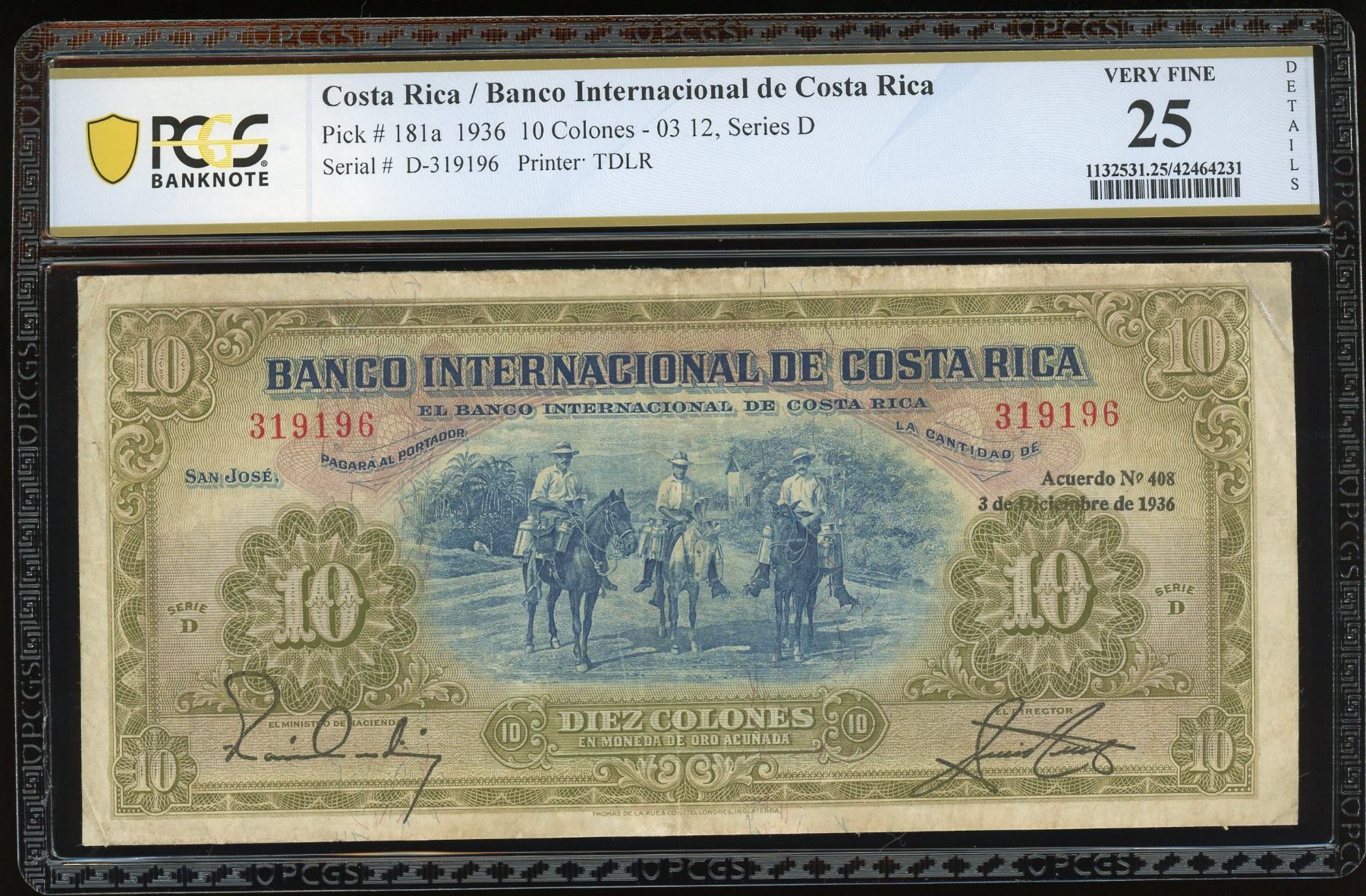 San Jose, Costa Rica, Banco Internacional, 10 colones, 3-12-1936, series D, serial 319196, PCGS VF 2