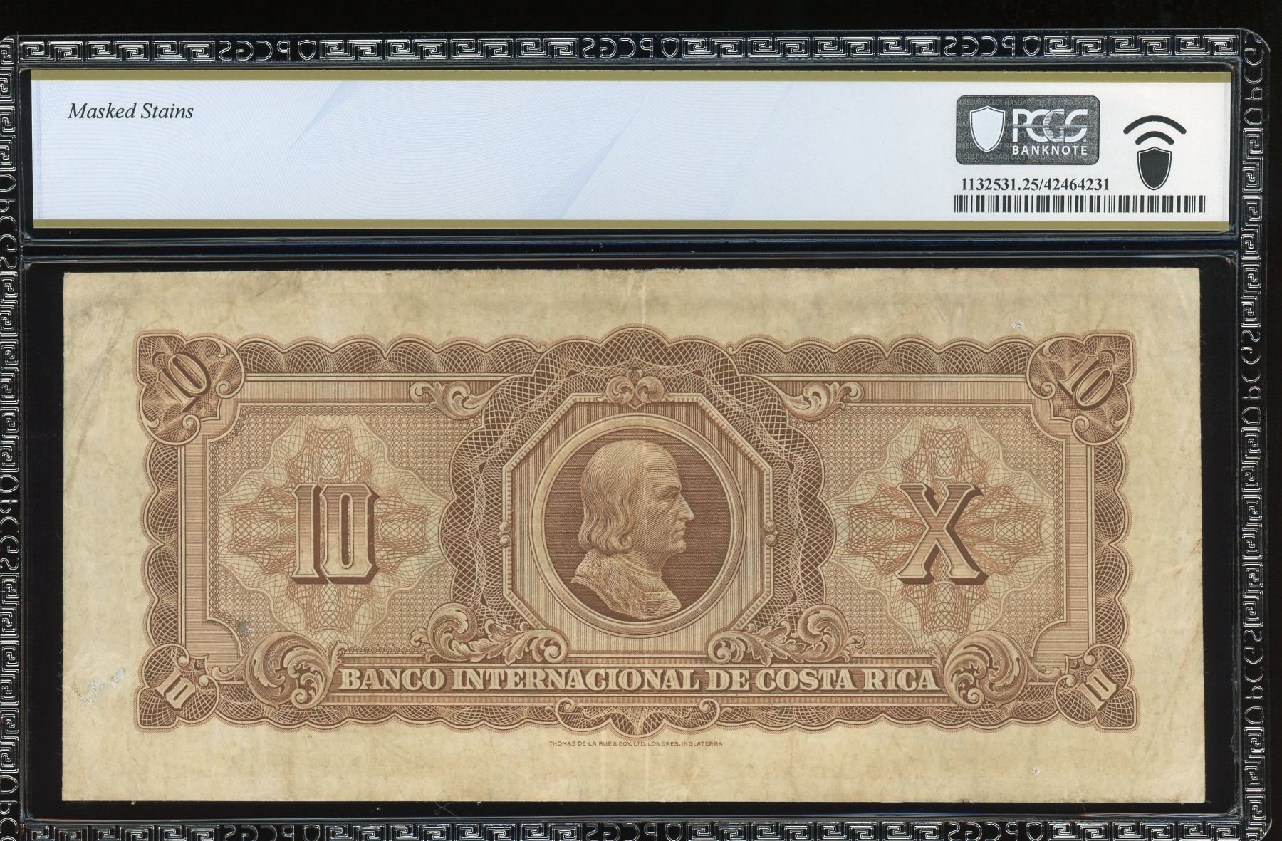 San Jose, Costa Rica, Banco Internacional, 10 colones, 3-12-1936, series D, serial 319196, PCGS VF 25 details, finest and only example in the PCGS census. SCWPM-181a. As mentioned with the prior lot, this note bears the correct spelling of Acuerdo in the overprint. Nice coloration across this attractively design note, minor masked stains noted on the back. Pedigreed to the Tamarindo Collection. Please use this link to verify the certification number