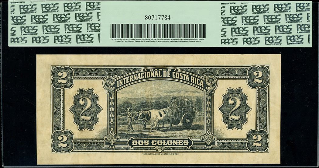 San Jose, Costa Rica, Banco Internacional, 2 colones, 5-8-1936, PCGS VF 25, series B, serial 896597, popular "Mona Lisa" issue. SCWPM-167. This iconic Costa Rican note printed by Waterlow & Sons features Leonardo da Vinci's "Mona Lisa" as the central obverse vignette while the reverse shows a rancher leading an ox cart. Well-centered and colorful printing, sharp corners and edges. PCGS #80717784.