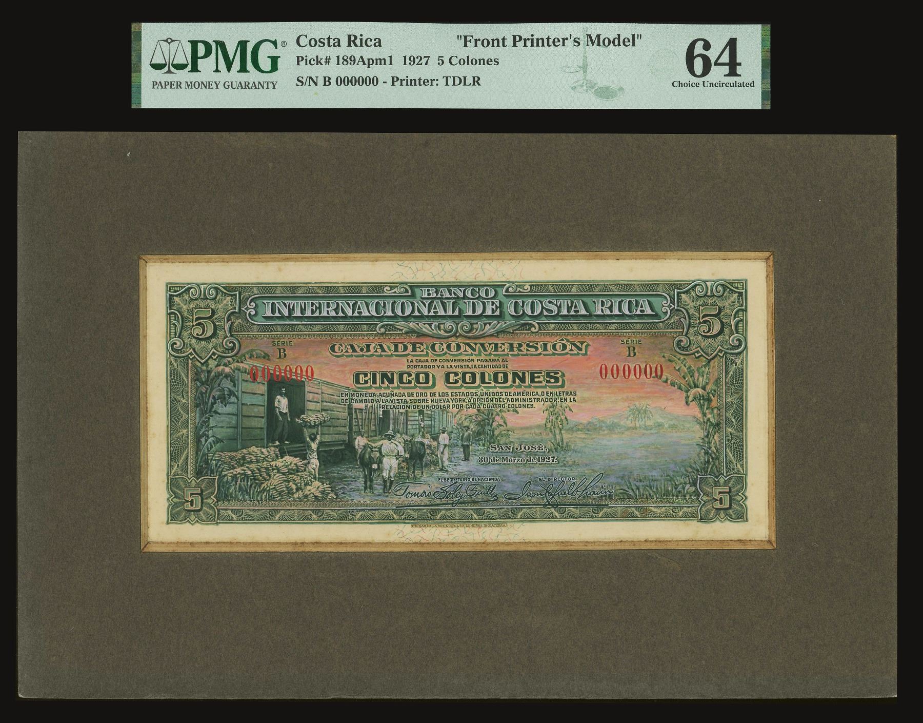 San Jose, Costa Rica, Banco Internacional, 5 colones front printer's model, 30-3-1927, series B, PMG Choice UNC 64, unique. SCWPM-189Apm1. As if the artistry for the 10 colones printer's model (as lot 95) could be topped, the gorgeous, hand-painted pink and blue hues across this unique 5 colones printer's model are particularly appealing. Every detail - borders, denominators, vignette, bank title - was carefully pasted to reflect the bank note's concept. The artist paid particular attention to the coloration and shading of the central vignette depicting bananas being loaded aboard train cars with a distant mountain visible in the background - a wholly Costa Rican scene. This design, with variations in perspective and coloration from this concept art, was later produced in 1929 though the vast majority of that limited print run was provisionally overprinted in 1937 and 1938 (SCWPM-189A, then 198 with the provisional overprint). As this design was modified and produced in low numbers with almost all overprinted, this concept model remains the only means to own this specific bank note design; it is mounted in a thick, heavy cardstock frame with Thomas de la Rue's stamp on the back. Please use this link to verify the certification number